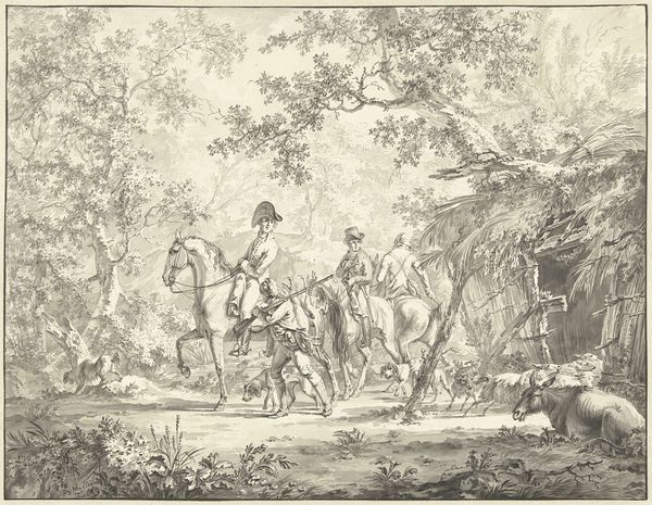 Curator: Well, isn't this a charming little sketch? A delightful window into...oppression? Editor: Yes, "Cluwer door de Pruisische huzaren mishandeld," or "Cluwer mistreated by Prussian Hussars." Jacobus Buys captured this narrative with pen and ink, probably somewhere between 1734 and 1801. What do you make of it? Curator: Hmm, on first impression? Unease. The loose sketch style feels immediate, raw almost. Those Prussian soldiers atop their prancing horses – one even stepping on the poor Cluwer sprawled on the ground. The scale feels intentionally…uncomfortable. The tiny figures, a whole village even, relegated to the background... the poor sod right in your face. Editor: Notice the way Buys contrasts the serene, almost pastoral setting—the church steeple poking through the trees—with the brutal act in the foreground. These weren't anonymous soldiers enacting orders. There's intentionality in the details like the elaborate headwear of the Hussars and the deliberate trampling that turns this event into a symbol of power over individual liberty. This feels very much a staged piece of visual propaganda. Curator: It does feel a tad theatrical, doesn't it? That sprawled figure practically begs for our sympathy. And is that tiny crowd a baying mob...or terrified witnesses? It’s all a bit...much. Almost romantic in its embrace of drama. Editor: Romanticism loved its drama! But more importantly, look how the visual weight pulls you from that small spire up into that swirling mass of leaves above. Everything points to the central figures...literally weighing down on the fallen man, forcing your eye and attention exactly where the artist intends. Curator: So it's less a straightforward depiction of violence, and more a carefully constructed… tableau of injustice? A symbolic performance, where the characters play their roles in a historical drama? I find myself wondering if this is to highlight something Buys perhaps has experience with or is against in principle? Editor: Precisely! Buys doesn't just show the event; he interprets it. In his hand the mundane, through artful arrangements becomes loaded iconography. These figures stand in as signifiers within a much grander narrative of conquest and resistance, of victim and aggressor, and what that may mean when stripped of military titles, power, and position. Curator: It's sobering to realize how much visual storytelling fits into this small drawing. Perhaps that feeling of unease I had wasn’t so far off, in retrospect. It's a potent thing, really. Editor: Indeed. There are certain visual languages we all instinctively know. They remind us of how carefully, deliberately our history has been taught to us over centuries of art. And they show just how little some of those languages have evolved at all.