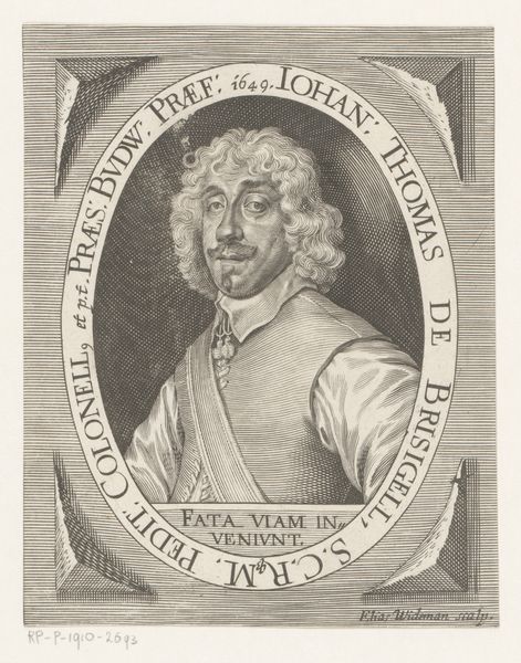 Elias Wideman made this print of Martinus von Landot in 1646. During this time, portraits weren't just about capturing a likeness; they were deeply intertwined with social status, power, and identity. Landot, a Vice Colonel, is depicted not merely as an individual but as a figure of authority. The inscription around the portrait, including his title and the phrase "Serà quel che Dio vorrà" – "It will be what God wants" – reinforces his position and perhaps a sense of divine right. It's a moment of asserting one’s place in the world, reflecting the hierarchical structures of 17th-century society. Prints like these circulated widely, shaping perceptions and solidifying social hierarchies. While Wideman's skill is evident, the print also serves as a reminder of how art could function as a tool for constructing and reinforcing identity. The emotional resonance lies in the tension between the individual and the societal role they inhabit. This artwork is a reflection of its time, offering a glimpse into the complex interplay between personal identity, social expectations, and the ever-present influence of power.