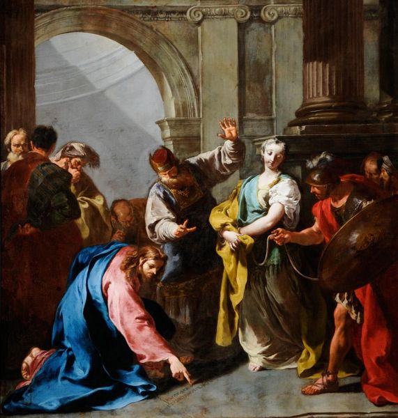 Editor: We're looking at Eustache Le Sueur’s "Presentation of the Virgin in the Temple," created around 1645 using oil paint. The subdued palette and classical architecture create a tranquil, almost ethereal atmosphere. What compositional elements stand out to you in this work? Curator: Notice how the strong vertical lines, exemplified by the columns and the figure of the Virgin, dominate the composition. This creates a sense of stability and order. The steps form a receding diagonal, drawing the eye into the scene and toward the light emanating from the upper right. Consider the implied lines of gazes and gestures – how do they orchestrate our visual journey? Editor: The gestures do seem very deliberate. The woman kneeling seems to be imploring, while Mary appears serene, even detached. What is the significance of this contrast? Curator: The contrast underscores a crucial binary – the earthly versus the divine. The kneeling figures, rendered in warmer, more vibrant colors, represent the human realm with its passions and supplications. Mary, depicted in cooler tones and elegant drapery, embodies spiritual purity and acceptance of divine will. Note also how the arrangement of figures divides the canvas into distinct planes, reinforcing this separation. Do you perceive how Le Sueur employs color to further this distinction? Editor: Now that you mention it, yes, the palette definitely guides the eye and dictates the tone. So, in essence, the composition, color choices, and use of line work together to create this profound statement. Curator: Precisely. By analyzing these formal elements, we unveil the underlying structure of meaning in Le Sueur’s "Presentation," transcending mere depiction to achieve a higher symbolic plane. Editor: It’s amazing how much you can glean just from the visual language. Thanks for showing me a different lens through which to view this piece.