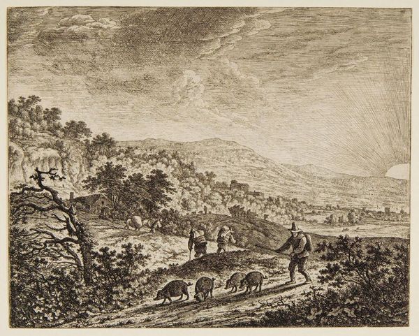 Jan Punt etched this landscape with a wolf and a dog in 1788. It presents a deceptively simple scene, but consider the cultural context in which it was made. The Netherlands in the late 18th century was a society deeply invested in moral and philosophical debates, often expressed through animal allegories. The wolf, traditionally a symbol of wilderness and untamed nature, is juxtaposed with the domesticated dog. This speaks to broader Enlightenment discussions about the balance between natural instincts and societal norms. The image creates meaning through its visual codes, referencing the prevailing social structures of the time. The wild wolf, though perhaps free, is also vulnerable. The dog has traded freedom for safety and comfort. Was Punt, through this fable, critiquing the comforts of bourgeois life or warning against the dangers of straying too far from societal expectations? To fully understand this piece, we delve into the literature and philosophy popular during Punt’s time. The meaning of art is always contingent on its social and institutional context.