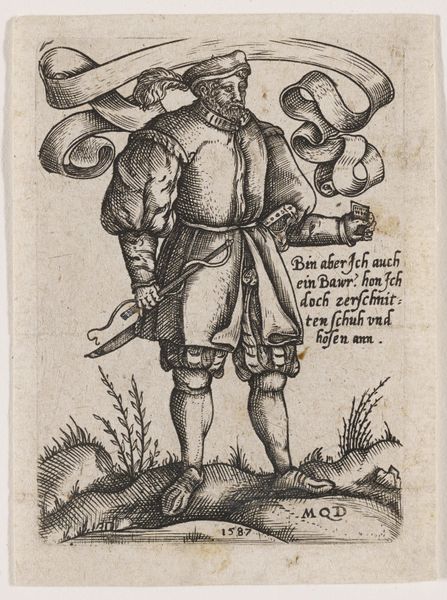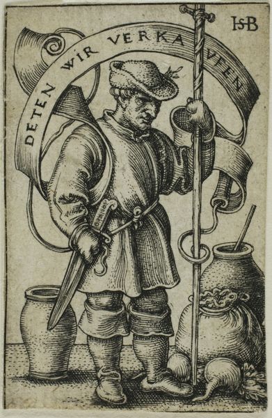 This engraving of a market peasant was crafted around 1530 by Sebald Beham. Here we see a peasant, his produce at his feet, bearing a sword. The banner reads, "With these we sell." But what does it mean? The sword, a symbol of power and authority, clashes violently with the peasant's status, thus creating a paradoxical figure that speaks volumes about the social tensions of 16th-century Germany. This is the time of the Reformations and the German Peasants' War. We see echoes of the medieval *miles Christianus*, or Christian soldier, suggesting an almost holy purpose, yet twisted. Consider the recurrence of the sword throughout history, from ancient Roman triumphs to Renaissance court portraits: its presence has the power to transform an ordinary man into an emblem of conflict. The artist taps into a collective memory of power dynamics, engaging viewers on a subconscious level. The image, therefore, is not just a portrait, but a potent blend of social critique, religious undertones, and psychological insight. It invites us to reflect on the cyclical nature of power, rebellion, and the symbols that shape our understanding of them.