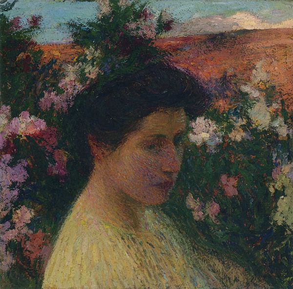 Curator: This is "Ung Dame Med Syriner", or "Young Lady with Lilacs," painted in 1897. Editor: Oh, what a gentle picture! The lilac's purple, the lady's gaze... It’s all a little dreamlike, a sunny afternoon suspended in time. Curator: The artist here, whose identity remains somewhat obscured, painted using the Plein-air technique, working outdoors to capture the fleeting effects of light and atmosphere. One can easily observe that the painting was done with oil paint. Note the brushstrokes and color palette employed to evoke that particular moment. Editor: The way the light falls on her dress! The brushstrokes are soft and blurry, which only enhances that dreaminess I mentioned before. And she seems so relaxed, like she's been walking among the lilacs for hours. I can almost smell their perfume! Curator: This portrait serves as a product and documentation of leisure within the context of a rising middle class. The painting immortalizes the act of women procuring natural elements as commodity. The textures of fabrics against the lilacs is very telling. Editor: That's fascinating! So, it's not just about pretty lilacs. This piece makes me wonder, what did her life truly look like, beyond this sunny picture? Was she picking them to arrange inside or for selling them on the market? Was her bonnet and beautiful clothing carefully planned and crafted in detail to communicate a status and convey values? Curator: That's exactly the dialogue that this painting sparks. In exploring the means by which such imagery and objects came into being, we start to uncover the hidden dynamics and social realities embedded within the artwork. Editor: It makes one appreciate it more. Not just for its beauty, but as a fragment of history with many meanings hidden beneath those gentle brushstrokes and lovely colors. Thanks for revealing some of them! Curator: Thank you for adding depth through your sensitivity and fresh artistic perspectives.