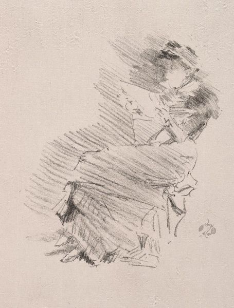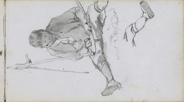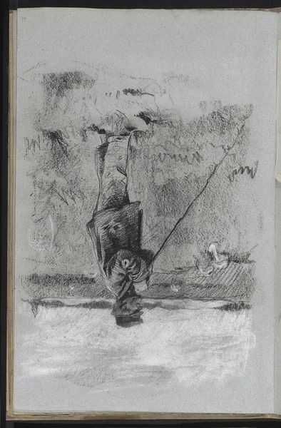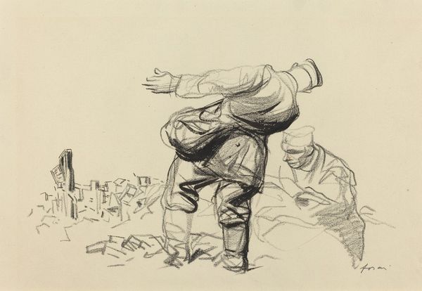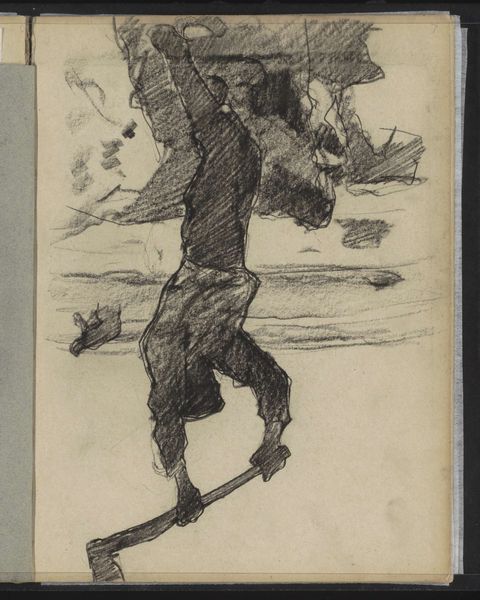 Curator: Ernst Ludwig Kirchner rendered this work, titled "The Sower," around 1905. The artwork employs ink and charcoal. Editor: My first impression is the image evokes a powerful sense of raw, almost primal energy through the urgent, angular lines. Curator: Kirchner, along with other Die Brücke artists, were deeply concerned with how industrialization was influencing identity and traditional forms of life in Germany. Images of labor, especially agrarian work, became symbolic ways to explore themes of identity. Considering these contexts allows one to consider how such imagery could carry weight as more than observation. Editor: I agree. Notice how the sower dominates the composition. His posture is bent, almost defeated. To me, this signals both a submission to nature and a symbol of timeless labor. The roughly drawn furrows also have the same symbolism—each marked line is as representative as it is literal. What’s more, look at how he almost blends with the house and nature: this creates an implicit sense of duty to family, history, and labor. Curator: The interesting parallel you're drawing speaks to Kirchner's investment in these figures being both ordinary people while also representing the community's shared trauma. His figures become sites onto which the audience could project concerns. It asks whether industrial advancements serve only to disconnect humanity, further creating conditions of precarity that marginalize the human in favor of capital. Editor: That trauma, and also those symbols of rootedness, I think, have a very persistent cultural echo in how we still think about self-sufficiency, family values, and the importance of hard work. They remain highly evocative concepts to this day, not just as lived realities but as politically loaded ideals. Curator: By situating the man against this desolate landscape, the themes within his actions are underscored with both futurity and dread: both hope and despair that comes when considering that, as time progresses, those at the margins always get further left behind. Editor: In that respect, perhaps "The Sower" is really speaking to us now as much as it was then—making us question what endures, and who truly benefits.
