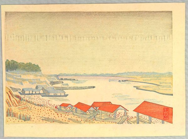 Editor: This is "Shore Scene Showing European Influence," a woodblock print by Shōtei Hokuju, created sometime between 1800 and 1830. It feels incredibly spacious and airy, doesn’t it? The composition spreads horizontally, with this wide expanse of water meeting the sky. What jumps out to you about the way it’s constructed? Curator: I find myself immediately drawn to the interplay between line and form. Notice how Hokuju employs a deliberate flattening of perspective, typical of Ukiyo-e, yet integrates elements suggesting depth, perhaps influenced by European printmaking. Observe how the rhythmic repetition of the boats in the harbor contrasts with the solid geometric shapes of the buildings in the foreground. Editor: The use of color seems quite restrained too, mostly muted blues, browns, and creams. Is that significant? Curator: Precisely. The subdued palette serves to unify the composition, drawing the eye across the surface. Ask yourself, does the restricted color palette enhance the graphic quality, emphasizing the lines and shapes? And how does the use of negative space—the areas of untouched paper—contribute to the overall sense of balance and harmony? Editor: That's interesting, how the flatness almost accentuates the details. Now I see a kind of tension between the flat picture plane and implied depth. The buildings are solid blocks, but then the figures introduce a sense of narrative. Curator: Consider then the role of each visual element. What is the interplay of texture and form? How might we analyze the contrasting forms of the geometric man-made buildings against the organic form of the coastline? Editor: I see that it is the combination of techniques that bring such unique perspective. Curator: Exactly. Appreciating the details allows one to truly begin understanding and perceiving works of art.