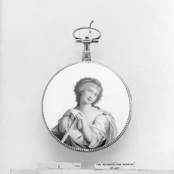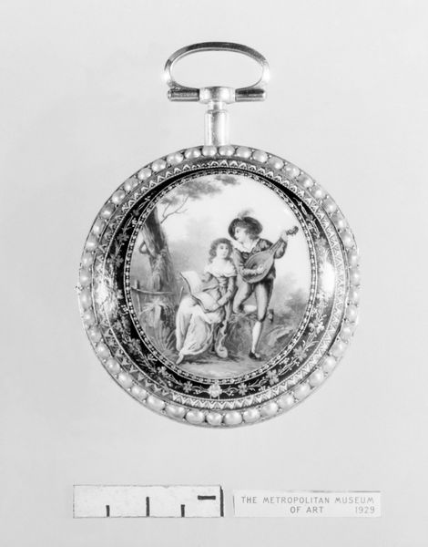 Curator: What strikes me immediately about this object is its intricate miniature scene—the details are incredible, especially considering the scale. Editor: Indeed! We are looking at an enameled watch dating from around 1785 to 1799, currently residing in the Metropolitan Museum of Art. It exemplifies a certain Neoclassical fascination with the classical world, shrunk down to pocket size. The watch is a testament to the decorative arts of the period. Curator: The composition is fascinating. There's a clear division of space, almost a diptych within the circular frame. We see a goddess figure wielding a shield on the left. Then there is what appears to be a shepherd, with a crook on the right. Note the subtle gradation of color in their robes, creating a sense of volume despite the size. It’s almost a stage, framed by the ornate watch casing. Editor: Watches in the late 18th century were more than time-telling devices; they were status symbols. The decoration indicates the social aspirations and aesthetic preferences of its owner, a statement of refined taste. Who are these figures? Minerva and a pastoral swain, perhaps? Curator: Perhaps. Regardless, their positioning—the shepherd seeming to present himself to Minerva, who is averting her eyes—introduces a dynamic narrative. The forms are rendered with surprising precision; you have the subtle highlights and the play of light and shadow that add depth, but all contained in this incredibly compact design. Editor: I’d speculate that these idyllic scenes are an ideal for what the person aspires toward at that moment: to embody a type of enlightenment through the Neoclassical return to Greek aesthetics. Its function speaks of modernity, its design longs for Arcadia. It's all so wonderfully paradoxical. These pocket watches were becoming a trend at the time amongst affluent folks, and you would take the art wherever you went, a mark of distinction. Curator: I see your point about the aspirational aspect; even down to the radiating lines behind the figures, visually pushing forward. But what really grabs me is that interplay of form and narrative—how such a small object contains so much compositional complexity and invites interpretations about the relationship between the figures. Editor: Yes, it does provoke interesting considerations, especially concerning how portable objects acted as visual indicators of a person's outlook during the Enlightenment and the rise of Neoclassicism. The way such small forms influenced identity, is remarkable.