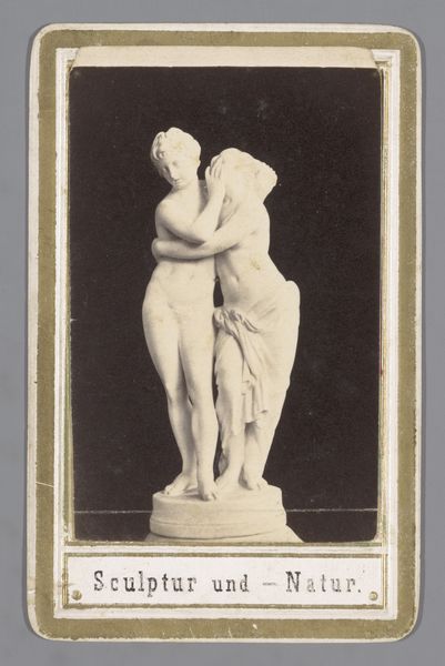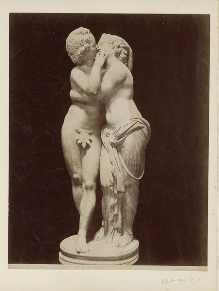 Editor: This is a photograph by Fratelli Alinari, dating sometime between 1857 and 1900, of a marble sculpture, "Sculptuur van Bacchus en Ampelos in de Galleria degli Uffizi te Florence, Italië." I'm immediately struck by the intimacy captured here, despite the formality of the photographic style. What do you make of this almost brotherly connection between the figures? Curator: Ah, yes, Bacchus and Ampelos, caught in a rather tender moment. It's curious, isn't it? While academic art often aims for a grand, almost detached ideal, here we have a definite leaning into, shall we say, the softer side of myth. Given that the image has been captured photographically, do you feel that shifts our perceptions away from conventional heroic renderings? Editor: Absolutely! Seeing it as a photograph rather than a painting or sculpture emphasizes its immediacy. I’m also picking up on a possible tension between the sculpture's inherent classical subject matter and the photographer’s artistic license to re-interpret through his particular medium. Curator: A delicious tension, indeed! Look closely at Ampelos gazing at Bacchus - note his almost pleading stance. Alinari isn’t simply documenting, he’s suggesting a narrative. Do you suppose he’s inviting us to consider Bacchus not just as a god of wine, but perhaps something…more intimately human? One might imagine it’s all about divine acceptance. Editor: That's really insightful. I was focusing on the formal aspects, but thinking about the possible narrative adds another layer. I like your interpretation on divine acceptance; especially since myth's tales are never totally complete and continuously offer up ways of filling in the blanks. Curator: Precisely! It dances with that in-between space, the lovely ambiguous muddle of human relations, which is really, isn't it, what great art often points toward. And if it leaves us something to reflect on then the photograph has certainly earned its keep!