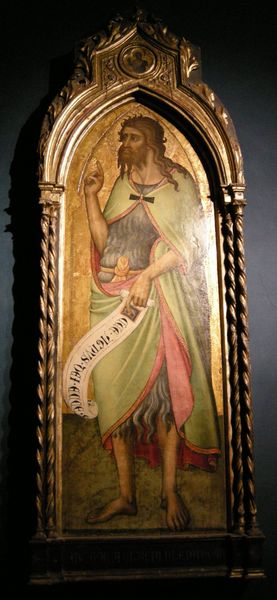 Curator: This is Luca di Tommè's "s. g. battista", a tempera painting from 1380. Editor: The figure strikes me. It's a singular portrait with a rather haunting stillness to it, even with the active gesture. What social narratives can be extracted from it? Curator: Well, portraits of saints were rarely just about the individual; they served a didactic purpose, offering models of piety. Consider John the Baptist – his ascetic lifestyle, his challenging of power. How does Tommè's depiction of him either uphold or challenge societal norms of the time? Editor: The subject's gaunt features speak to his austere reputation. The fact that his body isn't idealized makes him feel relatable, embodying penance. Does the inscription on the scroll provide further context to the narratives embodied in this piece? Curator: Absolutely. Deciphering the text on the scroll situates him within the framework of salvation and repentance. His words carry immense power, shaping beliefs and impacting the lives of those who followed him. How might the patrons have interpreted it? Editor: It’s all very thought-provoking. Understanding the portrait as a cultural artifact reflecting religious beliefs and power dynamics has really changed how I see it. Curator: Indeed. Art isn’t created in a vacuum. The socio-political and religious landscape of the time shaped its creation and interpretation. It makes you wonder whose voices were amplified and whose were suppressed in these portrayals, doesn’t it?
