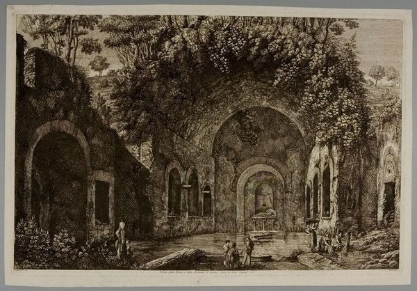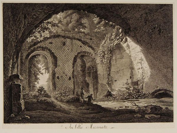Editor: We're looking at Albert Christoph Dies' "Porta scura o sia entrata nella villa Mecenate." I'm immediately struck by the contrast between the dark, enclosed space and the inviting landscape beyond. What do you see in this piece that speaks to its historical context? Curator: This print reflects the 18th-century fascination with the picturesque and the classical past. Consider how Dies frames the ancient ruins of Maecenas' villa. How does he use shadow and light to create a sense of romantic decay, popular with the era's elite tourists? Editor: So, it's not just about documenting the ruins, but also about creating a specific mood? Curator: Precisely. These images shaped the perception and reception of Roman history for a Northern European audience, influencing how they understood power and the passage of time through a carefully constructed visual narrative. Editor: That gives me a totally different perspective! Curator: Indeed. Seeing art as a product of its time, shaped by cultural and political forces, enriches our understanding immensely.