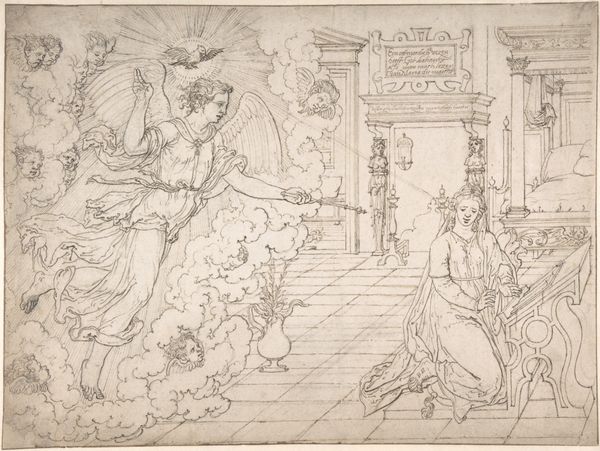 Curator: Simeon Solomon, active in the later half of the 19th century, rendered this drawing entitled "Faust and Marguerite." Editor: The sepia tones give it a dreamlike, almost ethereal quality, wouldn’t you agree? The stark lines create a sense of intimacy in what could be a much more grand scene. Curator: Indeed. The medium, ink on paper, speaks to Solomon's meticulous craftsmanship. And the narrative itself – Faust, the intellectual, and Marguerite, the innocent, a cautionary tale of power and seduction. Editor: The arrangement of figures within the composition certainly guides the viewer's eye. Faust leans into Marguerite as figures watch in the background, which introduces a tension between private and public. Curator: Exactly. One wonders if Solomon intended to comment on the societal constraints placed on women, their subjugation by powerful men. It certainly underscores the material imbalance between the two figures. Editor: It all coalesces into a poignant, almost unsettling tableau. Curator: Yes, a powerful reflection on desire, power, and the social structures that bind us.