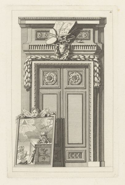 This is Jean François de Neufforge's drawing titled "Deuren met medaillons en hoornen des overvloeds", made using etching. The drawing presents a detailed rendering of a doorway, emphasizing symmetry and classical motifs. The use of hatching and fine lines creates texture which suggests depth and dimension. At first glance, the eye is drawn to the symmetry of the door and its overall composition. The symmetry lends a sense of balance and formality, characteristic of neoclassical design. The composition is divided into distinct horizontal and vertical zones. The door itself occupies the central vertical axis, while the entablature above forms a horizontal band, decorated with Greek key patterns and supporting sculptures. It's intriguing how de Neufforge manipulates depth using only line work. The receding planes of the moldings and panels are rendered through variations in line thickness and density. By blending architectural precision with artistic expression, the drawing invites us to consider the cultural values embedded within classical forms, where order, reason, and harmony are paramount. As you reflect on this piece, consider how such formal arrangements might reinforce or subtly challenge established meanings of space, power, and representation.