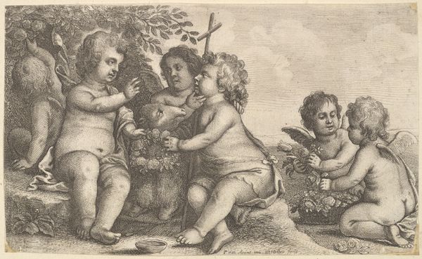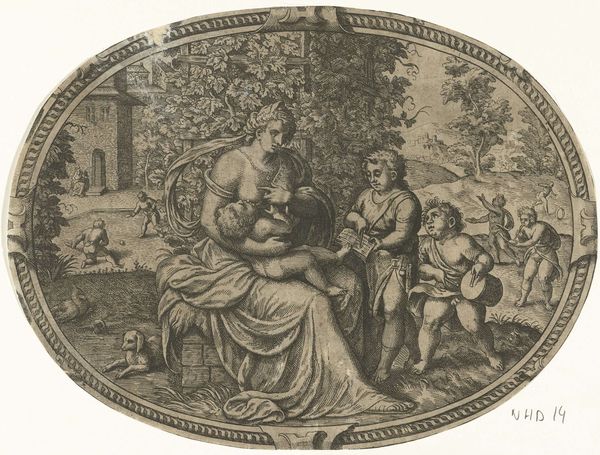 Editor: This is Annibale Carracci’s “The Madonna of the Swallow,” and it’s at the Harvard Art Museums. It's a small engraving. I’m immediately struck by the contrast between the detailed foreground and the more sketch-like background. How do you interpret the symbolism within this contrast? Curator: It feels like a glimpse into a dream, doesn't it? Carracci layers the sacred with the everyday. The detailed foreground, focusing on Mary and the Christ Child, grounds us. But the background—a tiny narrative of the journey into Egypt—hovers like a premonition. Perhaps he's suggesting that even in the most intimate moments, destiny looms. Editor: That's fascinating. I hadn’t considered the background as a premonition. Curator: What did you see? Editor: I thought the background was like a memory! It's like a quiet reminder that even the holiest family can have troubles. I think that is what the artist was trying to portray. Curator: Precisely! Art interprets and creates meaning. And to know there is no one true interpretation is a beautiful thing!