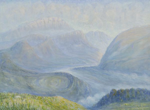 Curator: Mikhail Olennikov's 1984 painting, "Mukhorshibir, Tynui Open Spaces," utilizes oil paint to capture a sweeping landscape. Editor: Immediately, I'm struck by the hazy light, almost monochromatic; the scene feels vast and somehow lonely. The hills roll into the distance, their forms softened. Curator: Olennikov’s brushwork certainly contributes to that diffused effect. Note how he blends colors to create a sense of atmosphere; the lines are blurred, almost dissolving into the light itself. One might describe this haziness using a structuralist framework that examines how color and tone can produce a depth of field through subtle manipulation. Editor: Beyond its technical achievement, there's something very poignant about this particular depiction of the Russian landscape. In 1984, during a period of late Soviet stagnation, I wonder how the viewers saw an open and perhaps free depiction of the landscape. Did the absence of socialist figures reflect subtle resistance or merely a yearning for something more agrarian and removed? Curator: Interesting point! Focusing just on the painted surface, you can see the rhythmic arrangements of textures, from the foreground's fields, stacked and horizontal, to the background’s fluid hillside where the painter seems unburdened. This textural juxtaposition creates dynamism, a vital interplay, and thus, the very structure sings. Editor: I am particularly drawn to the little structures nestled at the base of the slope— they are so subtly rendered. These structures invite speculation. Were these collective farms? Private dwellings on display as socialist progress in the vast agricultural spaces? Their placement says something about society's imprint on even these seemingly untouched spaces. Curator: Undoubtedly, this landscape has become charged. When looking at its material elements such as form and color, it offers not just what it represents but *how* meaning arises. It makes me wonder what other insights close examination will give future viewers. Editor: And I am left contemplating the way historical context imbues landscape art with so much meaning; its continued power to be read as resistance or simply to promote the inherent connection with land and place.