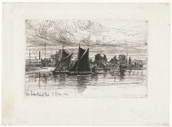 Curator: This is Johan Conrad Greive’s etching, “Gezicht op het Zuiderzee nabij Spakenburg,” dating roughly between 1847 and 1877. It now resides here at the Rijksmuseum. Editor: There's such a melancholy beauty to the greyscale tones; it's like peering into a memory, something almost forgotten but still lingering in the collective consciousness. The stillness in the water only adds to that, amplifying a profound sense of reflection. Curator: The image is deeply rooted in the Dutch Golden Age tradition, representing a specific place: the Zuiderzee near Spakenburg, which in the past, was the cultural and economical cornerstone of The Netherlands. Note how even the sailboats on the water have stories woven into their image. They act as a visual representation of connection and commerce, reminding viewers of the trade routes and exchanges. Editor: You're right, the sailboats almost act as leading lines, but the formal composition creates this incredible feeling of expansiveness using just monochrome shades. Notice, the horizon line almost bisects the print and draws the eye into the quiet sky. Curator: Skies in Dutch art of this period held particular importance, often being metaphors for fate and destiny. Clouds gathered symbolic value as well, often signifying impending doom or a change of fortune. But the presence of ordinary figures engaging with the boat suggests a hopeful narrative focused on resilience, tradition, and enduring community. The etching speaks of something permanent even as tides of change erode its shores. Editor: Yes, the symbolism lends a weighted quality to such humble material - but, looking at the formal characteristics of the print-making, the use of hatching to describe the water and texture on the boat and sand is extraordinary. I’m almost convinced I can feel the gritty dampness of that shoreline. The way he balances detail with atmospheric perspective—it's remarkably done. Curator: Indeed, there's a poignant interplay here, where the immediate tangible world meets a larger more intangible story of history, cultural memory, and maybe, the quiet hope for a horizon of one's own. Editor: Well, now I won’t be able to forget that the next time I stare out at the ocean, feeling contemplative or pensive. Thank you for your wonderful insight.