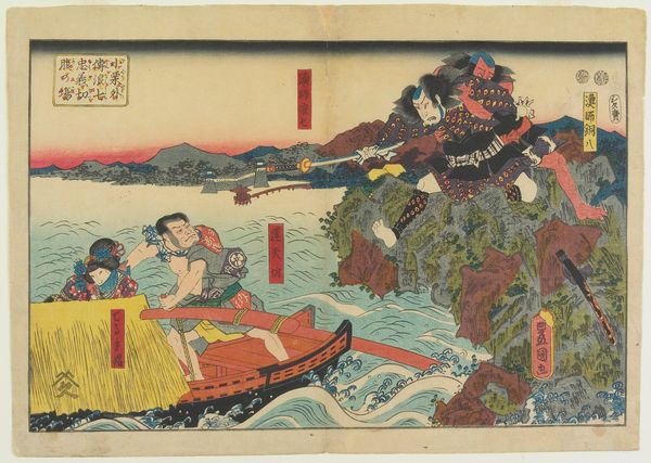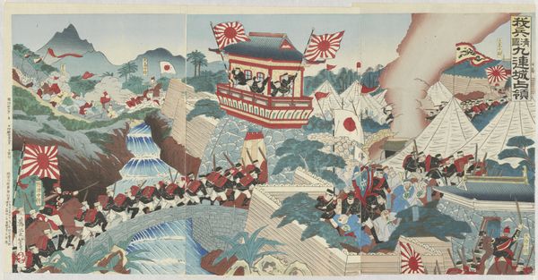Curator: Okay, let’s talk about this striking triptych. This woodblock print from 1894 is by Utagawa Kokunimasa, entitled "Fierce Fighting at Anseong Crossing in Korea." The print commemorates a battle in the First Sino-Japanese War. What’s your immediate impression? Editor: Chaos. Beautiful chaos! All these tiny figures thrashing through water under a luminous full moon. It feels almost dreamlike, if it weren’t for the… you know, the fighting. The composition is wild; the way Kokunimasa organizes this many figures into distinct groups creates depth. Curator: Absolutely, the materiality of ukiyo-e is key here. Think about the process – the carving of separate blocks for each color, the registration, the sheer labor. Mass production of such complex images speaks to the broad consumption of war narratives at the time. Editor: War as… consumer product. That's bleak, isn't it? Still, looking closer, I am thinking about the human element, right? Notice the way the artist depicts figures caught mid-stride or mid-slash, giving them personality in such small spaces. Curator: It is important to remember who this image was intended to serve. It celebrates Japanese military prowess, showcasing an industrialized army against what are presumably less well-equipped opponents. Consider how prints like these served to manufacture consent and support the war effort through mass media. Editor: Of course, but it’s hard to divorce the aesthetic impact from the context. There is the artist wrestling with something profound – even celebratory battle scenes echo something sorrowful and disorienting. This water, for instance, that washes over the field, blurs boundaries; It is lovely, isn't it? Curator: Right, but I am thinking of the water also quite practically. Its printing would've required nuanced carving to get that sense of depth and motion. Think about the specific tools and the labor, and the potential market that will see that craftsmanship and celebrate its detail. Editor: So, in our different ways, we see the impact, the artistry, and what it really represents, and we understand it better as a result of talking. This has made the artwork much deeper, as all art can be. Curator: Indeed, understanding art involves considering its creation, its consumption, and its lasting effects. A work that reminds us that artistic endeavors always reflect social processes.