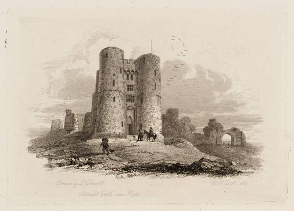 Curator: Here we have Abraham Rademaker’s drawing, "Ruin of Egmond Castle, South Side," dating roughly from 1685 to 1735, rendered in ink on paper. Editor: It’s so serene, almost melancholic. The sepia tones give it a dreamlike quality, even though it depicts decay. The towers are like skeletal fingers reaching for the sky. Curator: Rademaker was part of a trend documenting historical sites, but his process interests me. Drawings like these served as preparatory sketches for engravings. So the materiality itself embodies a journey, transforming observation into reproducible form. Editor: Absolutely. And this decay, the literal dismantling of structures, prompts questions about power. Who tore these walls down, and what societal shifts did that destruction signify? The tiny figures in the foreground only underscore that sense of history being weathered by the times. Curator: There's also a real market at play. These weren't simply historical documents, but commodities. Rademaker, working during a time when the Dutch art market was shifting, was very savvy about making visually interesting work. The drawing, while ostensibly about history, becomes something designed for consumption. Editor: It brings to mind similar power struggles, but with contemporary applications. We might consider the legacies of colonialism that manifest through architecture in formerly occupied lands or through social and racial housing inequities. Curator: The composition cleverly contrasts human-made structures with nature's relentless reclamation. Even on paper, the material evidence of that negotiation resonates. Rademaker’s lines illustrate not just buildings, but social transformation and human intent in shaping our world. Editor: In short, even what we consider aesthetic choices are very much interwoven with larger cultural landscapes and should be assessed under the scrutiny of justice, labor and politics. Curator: Indeed, and by recognizing how these themes intersect, we deepen our own understanding. Editor: This work provides fertile ground to challenge existing cultural canons.