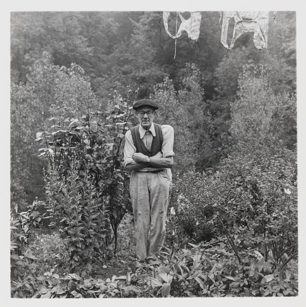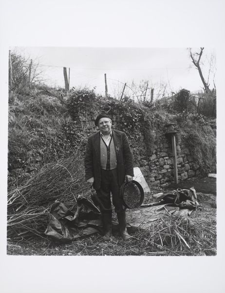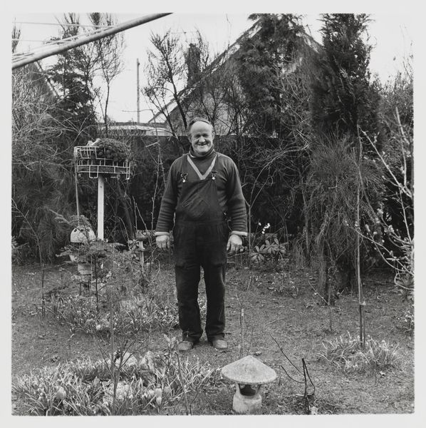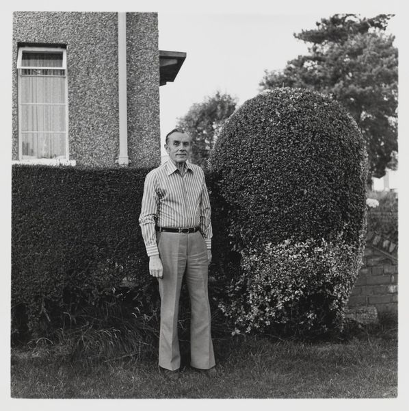 Curator: Keith Arnatt's photographic work, simply titled "Gardeners", presents a man standing squarely in a garden setting. The piece is held in the Tate Collections. Editor: My initial impression is one of gentle melancholy. The black and white palette and the rather still pose create a sense of quiet contemplation. Curator: The gardener’s presence in this image acts as a powerful symbol. His attire, the land, they trigger an almost archetypal connection to nature and labor. Editor: Absolutely, but what strikes me is the composition—the gardener centered, framed by that archway. It creates a strong focal point amidst the organic chaos of the garden itself. Curator: Indeed. It is fascinating how Arnatt uses a commonplace image to evoke a sense of the timeless relationship between humanity and the earth. Editor: Precisely. The tonal range and texture give the impression that we are meant to look at this person as both a subject and an object and consider who is tending to who. Curator: A perfect encapsulation of the symbolic tension within this quiet image. Editor: Agreed. A thoughtful work offering a subtle commentary on our place in the natural world.