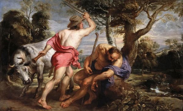 Editor: This is Anthony van Dyck's *Rinaldo and Armida*, painted around 1629, using oil. I find the scene both chaotic and captivating; figures in various states of undress caught in a swirl of action. How would you interpret the symbols in this work? Curator: The symbolism here is rich, drawing heavily on the epic poem "Jerusalem Delivered." Note Armida's powerful gesture, attempting to bind Rinaldo with flowers - a visual representation of seduction and the entrapment of a warrior by love. But look at the Cupids, and you will notice one of them aims an arrow at Rinaldo, reinforcing the concept that love's wound is like war’s. Do you notice any cultural connections here? Editor: Well, there's definitely a contrast between Rinaldo’s armour and Armida’s exposed state, which perhaps speaks to the clash between duty and desire. Also there's another Cupid reaching up from the ground to place a helmet on Rinaldo’s head. Curator: Exactly. The discarded armour beside them underscores the abandonment of martial virtues for earthly pleasure. Even the landscape echoes this theme, shifting from a wild forest to a softer background implying ease and beauty, which stands as a direct counterpoint to war. The symbolic language tells a clear story. And how is that story communicated? Editor: The artist uses specific characters to convey this story with love, conflict and pleasure. Van Dyck communicates it through a universal experience, not bound by any one time or place. Curator: Precisely. The narrative is rooted in specific characters and the poem "Jerusalem Delivered," and presented as something eternal, where even viewers centuries later can empathize with this visual allegory of desire and surrender. Editor: Seeing it laid out like this makes this artwork way more complex. Thanks! Curator: My pleasure, now, every time you come across some art, let yourself think, what cultural associations does this evoke?