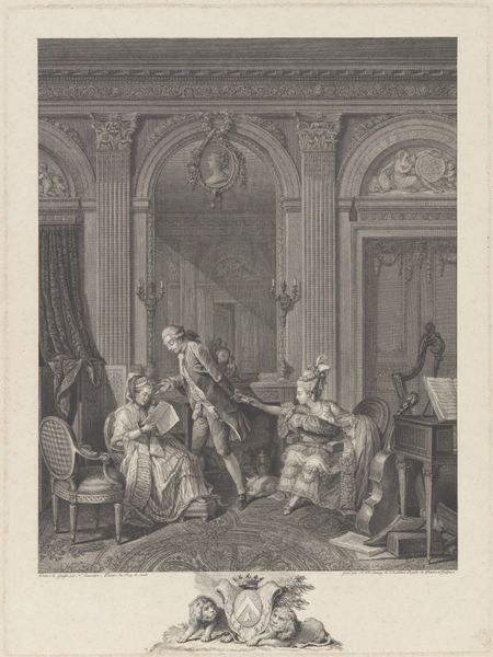 Jacques Philippe Le Bas created this print, “Interior with Card Players,” sometime in the 18th century. The intricate lines and carefully placed figures create a scene rich in texture and detail. The composition focuses on a group of people gathered around a card table, set against an ornate interior with large windows and decorative wall panels. Le Bas uses the linear precision of engraving to capture the material qualities of the room and the social dynamics of the figures. The contrast between light and shadow emphasizes the textures of the clothing, the table cloth, and the architectural elements, adding depth to the scene. This attention to detail reflects broader artistic concerns of the time, where the representation of social life and material culture became a means of exploring identity and status. The arrangement of figures around the table creates a sense of circularity. The play of light across their faces and attire adds a dynamic quality to the print. "Interior with Card Players" offers a glimpse into the aesthetics of 18th-century society, reflecting how art can capture and communicate intricate layers of meaning through its formal qualities.