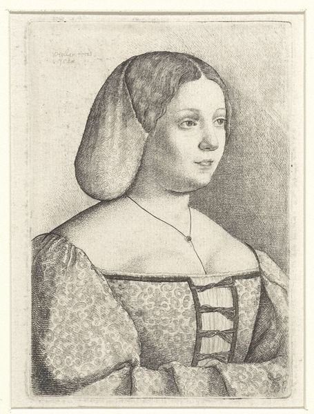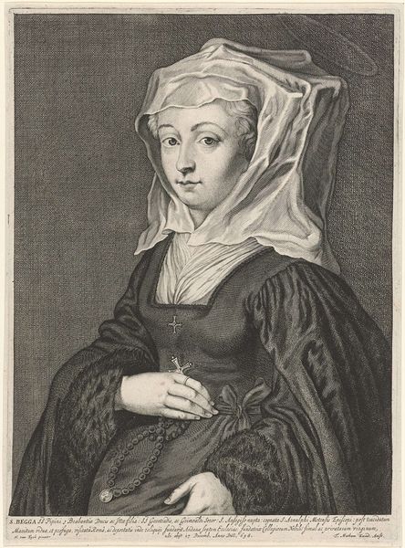 Editor: Here we have Wenceslaus Hollar's "Portret van een vrouw met Franse kap," made in 1646. It’s an engraving and has a cool, restrained feeling. I’m struck by her gaze and the incredible detail in her clothing. What stands out to you about this piece? Curator: I’m drawn to the ways in which this portrait encapsulates the construction of gender and power within the context of 17th-century European society. Hollar's work invites us to consider the role of adornment—the French cap, the elaborate jewelry, the fur—as markers of status and identity, reflecting the complex interplay between personal expression and societal expectations. How might this portrait, in its careful detailing of attire, be read as an assertion or even negotiation of power within a patriarchal structure? Editor: So, her clothing isn't just fashion, but maybe also making a statement? Curator: Precisely. Consider also the gaze: is it assertive, or is there perhaps a hint of melancholy, reflecting the limited agency afforded to women of that era? And how does Hollar, as a male artist, participate in shaping this representation? These questions open up avenues for exploring the intersections of gender, class, and artistic representation, revealing the portrait not just as an image of a woman, but as a document of its time, fraught with social and political meaning. Editor: I hadn't thought about it that way. It's interesting to consider her agency, or lack thereof, in how she is portrayed. I'm starting to see this piece less as just a historical image and more as a complex commentary on its era. Curator: Absolutely. It’s about disrupting the traditional art historical narrative and injecting it with critical social awareness. Hopefully, you can help other students engage and think more critically about similar works in the future.