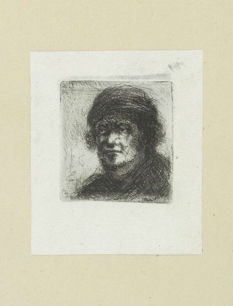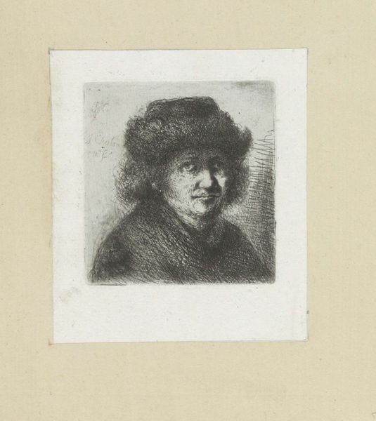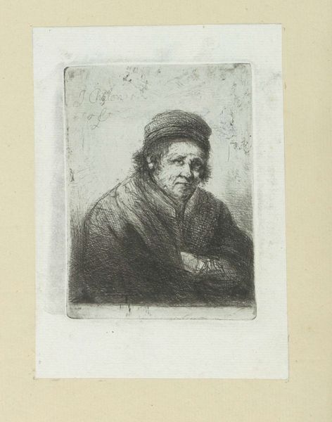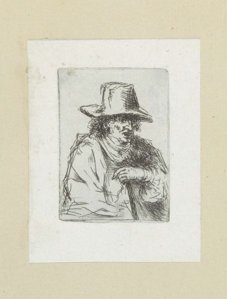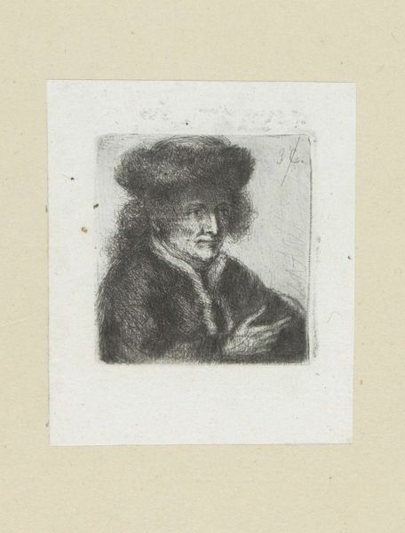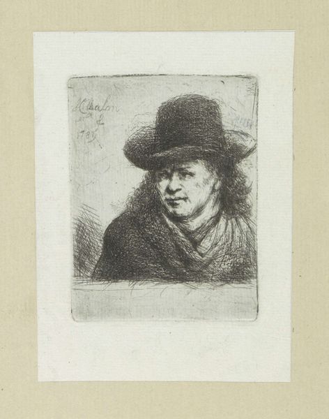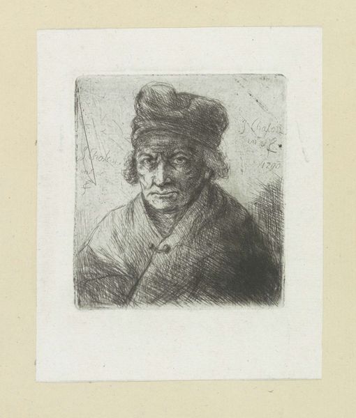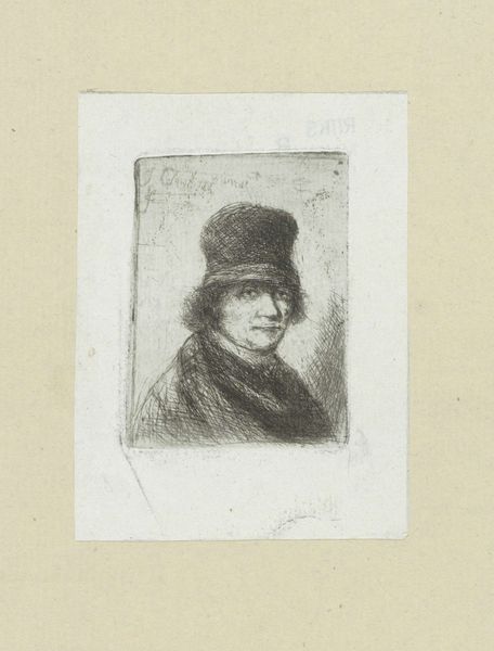 Editor: So, here we have "Adult Man with Hat" created in 1802 by Jan Chalon, using engraving techniques. It's a striking portrait. I’m immediately drawn to the man's intense gaze, there’s a kind of weariness in his eyes and, honestly, I feel a melancholic mood in this portrait. What's your take? What catches your eye in this piece? Curator: It whispers tales, doesn't it? A certain gravity in the line work. Look closely at the etching – like wrinkles mapping a life. I see resilience etched on his face. Do you feel it too? It's as if he's staring directly at you, not quite confronting but really witnessing. What might this have to do with what was going on in 1802? Consider the social upheavals rippling through Europe at this time – revolution and so on! Chalon seems to freeze an individual shaped by great historical pressure, doesn't he? Editor: Yes, absolutely! And that realistic style further emphasizes that grounded feeling. Do you think Chalon aimed to convey some inner turmoil, or merely capture a likeness? Curator: Likeness wasn't simply copying, but capturing someone's essential self back then, I reckon! It feels… well, devotional. And there is more, perhaps. The choice of rendering him in such an…unromantic way – really underlines his status as an individual in a world swept up by mass movements. He's holding fast to his soul, this bloke is! Editor: That's fascinating! I hadn't considered the individual versus the collective context so clearly. It completely shifts my interpretation of the work. Curator: Good art always offers a keyhole – to another time, another mind…or your own. Isn't that glorious? Editor: It truly is! Thanks for your insight, I’ll definitely look at portraits differently now!