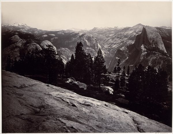 Editor: Here we have a photograph from 1864-65, "Valley of the Indus River near Gagangir, Jammu & Kashmir, India" by Samuel Bourne. It's just… overwhelming. So much nature! A grand vista with moody shadows. What do you see in it? Curator: A great deal of ambition, frankly! Imagine lugging that equipment around 19th-century Kashmir. Beyond the sheer physical effort, it suggests a yearning to capture something monumental, something permanent. A kind of Victorian-era "wish you were here" on an epic scale. Tell me, what does that slightly washed-out, almost ghostly quality evoke for you? Editor: A sense of distance, both geographical and temporal. It feels like I’m looking at a place that’s very far away, both in miles and in time. Does the composition tell us anything? Curator: I think it's fascinating, particularly the way Bourne leads your eye. Note how the river carves a path into the distance, almost daring you to follow. It’s carefully constructed, wouldn't you agree, leading us deeper into this wilderness that he has, to some extent, mastered, tamed even, simply by framing it. It becomes a romantic exploration. Editor: I see what you mean! So, it’s less a document and more… a carefully crafted experience? Curator: Exactly! A carefully crafted *memory* of an experience, filtered through the lens of Victorian ideals. And, in some ways, ours as well now. It makes you wonder about the countless other, unseen, untold experiences that lay hidden in shadow. Editor: That's beautifully put! It completely changes how I see the image, and makes me think about what Bourne chose to leave out. Thanks! Curator: And thank you! You’ve given me a renewed appreciation for its ability to transport us across continents and eras. It makes you question, is this staged for aestheticism or a pursuit of understanding? It can be both.