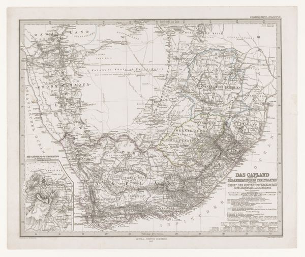 Editor: Here we have "Kaart van West-Polynesië," a print combining etching and engraving, created in 1858 by Carl Poppey. It is quite detailed and covers a vast area; its cool color palette makes me think of old sea voyages. What stands out to you in its visual presentation? Curator: The map intrigues primarily due to its method of construction. The etched lines create a network, meticulously segmenting the depicted space, whilst the engraved details – consider the lettering and the subtle shading used to denote landmass – display an objective contrast, providing legibility. Consider the tension achieved between functionality and aesthetic quality. Does that not impress you? Editor: It does! I appreciate how the lines give a sense of order to what I imagine is an incredibly chaotic, sprawling space. It’s almost like trying to contain the ocean. Curator: Precisely. The use of line, carefully planned, dictates the viewer's journey across the expanse of the map. The eye is directed from one coordinate to another. Note how the gradations of tone provide depth and contrast. Editor: The restrained color palette almost abstracts the landscape. The washes of gray and green differentiate land from sea, yet keep the emphasis on the geometry of the lines. Curator: An astute observation. Do you consider how the engraver employs visual language with economy and refinement, and through that approach constructs a captivating image? Editor: I do now! Before, I was mostly interested in the content. I see the choices Poppey made relating to the engraving’s visuality have such an impact, which shifts the meaning. Curator: Exactly. Studying Poppey’s orchestration of line, tone, and compositional structure unveils deeper complexities. One can observe much with simply focused observation.