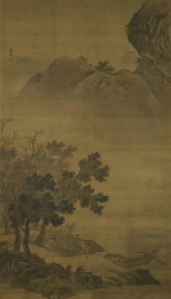 Curator: Look at this magnificent landscape hanging before us; it's a Chinese ink painting titled "Listening to the Waterfall," dating back to approximately 1450, artist unknown. What are your first thoughts? Editor: A certain stillness pervades. The muted palette and soft lines create a sense of quiet contemplation. It feels very removed from the bustle of daily life. Curator: The anonymous artist truly captured a sense of hermetic tranquility. Waterfalls in Chinese painting are often visual metaphors for the Dao, a symbol of ceaseless transformation. It reminds one of our constant need to self reflect through contemplation. Editor: I agree, the presence of the waterfall as a source of spiritual metaphor is undeniable. Water motifs recur across time, often serving the ideological functions demanded of painting in a given period. In this piece I imagine that is part of its cultural draw. Curator: Indeed, the Daoist concept of living in harmony with nature is very important. The human figure seems purposefully diminished in scale in relation to the natural landscape. Editor: It’s interesting to think about the intended audience and context of such works. I wonder where this was hung, or under what circumstances it was originally viewed. What messages of power might it subtly be reinforcing? Or was it purely for aesthetic enjoyment, this feeling of closeness to nature? Curator: Perhaps it’s not so binary. Paintings like this could function on multiple levels; both reaffirming social values, but providing the mental space for individuals, especially elites, to imagine alternative modes of being. Either way it holds such a profound quality and meditative power that it has affected generation after generation. Editor: A duality of both, yes. Its survival, and display, speaks to an enduring desire. Curator: It makes one wonder how this particular painting survived. So much is now lost forever. It stands today, reminding us that our existence is so miniscule when looked at from a geologic perspective. Editor: Its survival serves as an encouragement to the pursuit and contemplation of visual artifacts as echoes from history, across a bridge of signs and aesthetics.
