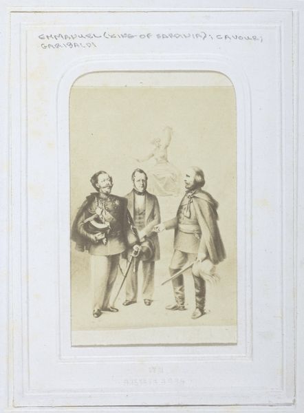 Editor: This gelatin-silver print, titled *Portret van het Joachim Quartet*, was taken between 1889 and 1895 by Loescher & Petsch. The quartet members—Joseph Joachim, Robert Hausmann, Emanuel Wirth, and Karel Halíř—are elegantly arranged. It's striking how their poses, though posed, still manage to convey a sense of musical camaraderie. What structural elements stand out to you? Curator: Consider the photographic frame within the larger frame. This sets up a fascinating dichotomy between what is presented as captured reality and the constructed nature of the photograph as an object. Editor: That's interesting. Curator: The tonal range, predominantly in shades of sepia, emphasizes the textural details—the instruments' polished wood, the fabrics of the men's suits, even the subtle gradations in their skin tones. The lighting, while soft, is deliberately structured to highlight each musician’s face, suggesting a democratic interplay even within the quartet’s visual hierarchy. Notice how the cello acts almost as a vertical anchor. How would you analyze the visual rhythm within the composition? Editor: I guess you could read the players almost like musical notes along a staff. Curator: Precisely. Furthermore, examine the visual balance between the quartet members and the negative space around them. The composition adheres to a carefully constructed asymmetry. The gazes draw us to different points and balance against the musical stand and its sheet music, the presence of which implies a score binding them together. Editor: I see what you mean about how much the construction creates and informs meaning. I’ll pay more attention to composition moving forward. Curator: And I shall look to you for guidance regarding your personal experiences viewing these portraits. Thank you!