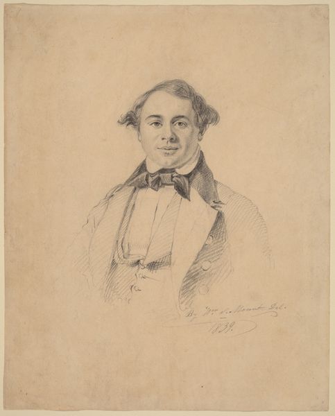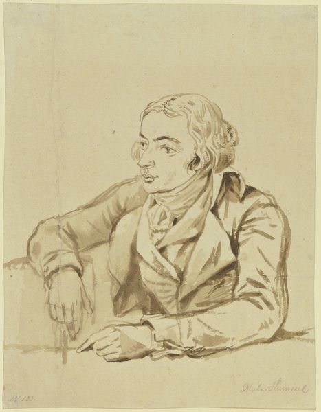 Editor: So, this is J.F. Clemens' "Portræt af digteren Johannes Ewald (1743-81)" from 1779. It looks like it's a drawing, using charcoal and pencil. I find it so delicate and evocative. What strikes you when you look at this piece? Curator: I'm drawn to the artist's process and material choices. Consider the economic reality: Clemens, as an engraver, would have readily had access to these drawing materials, relatively inexpensive means to produce an image that could then serve as a model for a print, intended for wider distribution and consumption. Editor: That’s interesting – so it wasn't necessarily about creating a precious, unique object, but more of a step in a process? Curator: Precisely. How does the roughness of the charcoal, versus the fineness of the pencil, affect your perception of the Romantic era it's placed in? Do the means and material used speak about accessibility of image making and dissemination to a wide population? Editor: I never thought about it like that. It seems to democratize art-making, making portraits less reliant on expensive painting. That actually fits with the Romantic ideals of individual expression, available to more people. Curator: And what might Ewald's status as a celebrated poet contribute to our reading of this portrait as a commodity? Does it elevate its market value, given its association with a figure already known and esteemed in society? Editor: I suppose his image has inherent value for his followers, and reproducing it makes him more available, while generating work for the artist. I hadn't thought about the relationship between the artistic process, access, and fame in this way. Curator: It's all interconnected! Examining art through its materials and means of production opens up interesting avenues to think about artistic intentions, accessibility, and how art circulates within a society. Editor: Exactly. I'll definitely be thinking about materiality more critically in my own work.