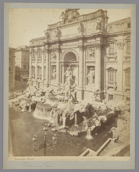 Curator: Welcome to the Rijksmuseum. Today, we'll be looking at a 19th-century albumen print, titled "Trevifontein te Rome, Italië," an evocative image capturing the Trevi Fountain in Rome. Editor: My first impression is the photograph's stillness. Even with all that sculpted water, there's a kind of serene grandeur, like a captured memory of an ancient stage set. The monochromatic tones enhance the architectural details, almost ghostlike. Curator: Indeed, this albumen print, created sometime between 1851 and 1890 by an anonymous photographer, provides a fascinating glimpse into how cultural monuments were being documented and disseminated in the mid-19th century. This predates mass tourism as we know it, though seeing these images helped encourage mass pilgrimage across Europe. Editor: Look closely, and you’ll notice how Oceanus, that imposing figure in the central niche, dominates the entire composition. It speaks volumes about how Baroque sculptors envisioned the relationship between humans and the natural world. Notice, though, that his iconography blends older and newer influences: both classicized forms reminiscent of antiquity but also a bombastic self-confidence so particular to 17th and 18th century art. Curator: And let's not overlook how the architecture is rendered. The photographer carefully balances light and shadow, emphasizing the fountain’s integration within the urban landscape of Rome. Early photography's diffusion acted as advertising for architectural trends throughout Europe, but, equally, promoted a classical architectural legacy in national collective memories. Editor: The details draw the eye—the frolicking figures and seahorses and even the blurred human presences that seem oblivious to this aquatic explosion. One might say the architecture is the hero here, but to me the symbolic charge is that the viewer also becomes a hero within a symbolic performance by entering into a historical space of collective memory. Curator: That interplay is at the heart of why this photograph resonates. The fountain, designed by Nicola Salvi, was completed decades before this image was captured, yet the image helps re-stage its place in Roman identity at a period of Italian unification, functioning to place a modern Italian identity atop ancient and Renaissance legacies. Editor: It becomes more than just a record of place; it transforms into a mirror reflecting our continuing fascination with the eternal city. Even now. Curator: Exactly. So a humble albumen print tells a bigger story of urban representation and the ongoing process of creating and negotiating history. Editor: What I find most fascinating is how a piece seemingly so straightforward holds complex symbolic stories.