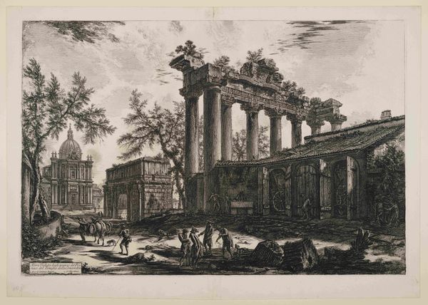 Curator: This etching is entitled "Villa of Maecenas at Tivoli," crafted in 1763 by Giovanni Battista Piranesi, residing here at the Minneapolis Institute of Art. Editor: It’s striking, isn't it? The density of the architecture, and the textures that almost appear sculpted, yet it's all lines etched into a plate. Gives it a real sense of gravity and antiquity. Curator: Indeed. Piranesi was renowned for his masterful manipulation of line and tone. Looking at the materiality of the printmaking, you see how his meticulous process contributes to the perceived weight and scale of the structure, blurring lines between the "high art" of architecture and the reproducible craft of printmaking. Editor: Absolutely. Think of the social implications: Piranesi is not just documenting this ruin; he's circulating a vision of Roman grandeur, and a certain melancholic reflection on the past. What was the perception of ancient structures like this during that time? Curator: Well, during the 18th century, sites like the Villa of Maecenas became pivotal touchstones for Neoclassicism. This interest sparked exploration in the physical processes that contributed to not only the depiction but also the idealization of such spaces and, naturally, to questions of production and the cultural and artistic impact. The prints were commodities circulating images of Roman splendor and, in turn, reinforcing political power. Editor: Right. The Roman past was often used to legitimize contemporary political agendas. Plus, consider who was buying these prints—likely wealthy patrons, participants in the Grand Tour—and how owning such images reinforced their status. This all reveals much more than Roman ruins—it speaks to art as a form of political imagery. Curator: Exactly. And think about the labor involved: the quarrying of the stone, the construction of the villa in its own time, the careful and demanding printmaking process… all these human acts layered into this image! The artist becomes the middleman of materials, time and the socio-economic landscape. Editor: That's such an essential reminder: these images weren't simply plucked from the earth. Piranesi wasn’t neutral, neither are we for that matter. He and his social status directly impact what is chosen to be showcased, and furthermore how this "showcasing" impacts future receptions. This helps reveal how images such as these served specific cultural functions then, and continue to today. Curator: Seeing this, knowing what we know, allows us to more carefully consider the dialogue between the materials, the artwork, and the history around it. Editor: A lasting point well made: and to not overlook our dialogue as observers into a broader and continued understanding.