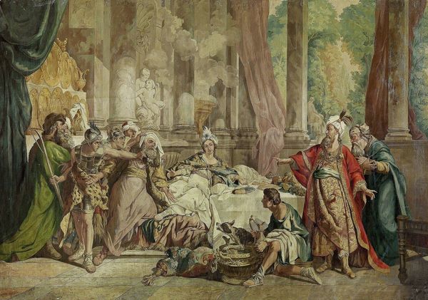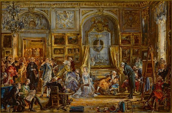 Editor: We're looking at Jan Matejko's “Death of Sigismund Augustus in Knyszyn in 1572,” painted in 1886 with oil on canvas. My first impression is pure drama. So much frantic energy around a deathbed! It makes me wonder about the king’s legacy. What do you make of it? Curator: Oh, this one’s a swirling vortex of Polish history and Matejko's theatrical flair. Imagine the scene, really imagine it! A king's passing is never just a personal affair. It's a tectonic shift for a nation, particularly a nation like Poland in the 16th century facing a succession crisis! But tell me, does the chaos feel… truthful? Or a bit… *staged*? Editor: Definitely staged! The colors seem heightened, everyone is in such exaggerated poses of grief or panic. Is that just Matejko's style? Curator: Partly. It's Academic art, a dramatic Romanticism, history painting. But think about WHY he’s staging it. He’s not just illustrating; he's *interpreting*. Matejko wanted to remind his viewers – Poles under foreign rule – of the greatness, but also the vulnerabilities, of their own past. He wants them to feel it in their bones. See the frantic scribbling and hush-hush consultations? They reflect the great stakes after the last Jagiellonian King dies without an heir. Editor: So it's less about historical accuracy and more about… national inspiration? Almost like a political statement through paint? Curator: Exactly. That's the brilliance of Matejko. Each figure is loaded with meaning, each object whispers a secret of Poland's destiny. Look closely—what do *you* think Matejko thought of this ending, or beginning, depending on your view of this moment? Editor: Hmmm… I see now that it's more than just a scene of death. It’s a commentary on a pivotal moment in Polish history and maybe, on Poland's continuing need for strong leadership. Curator: Indeed! And perhaps, a caution against the very chaos it depicts. History seldom shouts its lessons quite this loudly, don't you think? It makes you wonder how we stage *our* national narratives today!