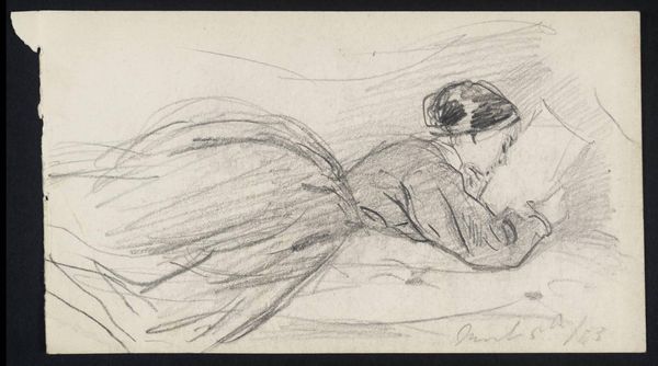 Curator: This is Edgar Degas’s "Dancer Resting with a Fan," likely created between 1890 and 1895. It's currently held at The Art Institute of Chicago. Editor: The immediate impression is one of exhaustion, almost defeat. Her pose is so heavy, draped over what appears to be a bench. It's starkly contrasted by the delicate fan she holds. Curator: Indeed. Degas was fascinated by the grueling work behind the apparent grace of ballet. He often depicted dancers backstage, capturing moments of fatigue and mundane reality, far removed from the spectacle of the performance. We should also observe how the composition places her outside any explicit context. Editor: Agreed, but that allows us to focus intensely on form. The use of charcoal and pastel creates a textured surface, adding depth to her tutu, although this depth isn't always photorealistic. The pencil lines define not only shapes but also seem to map the planes of her emotional state. Curator: Precisely. Think about the labor involved in producing this image too. The constant redrawing, the deliberate blending of charcoal to suggest both form and shadow—all point to Degas's interest in the process of representation itself. Editor: How much the subject might contrast how such 'high' art was consumed then. Here we glimpse the world of dance, yet consider it rendered on paper, itself another commercial enterprise with different connotations of value at that time. Curator: I agree it asks some powerful questions about labor but also reminds me of the beauty Degas manages to draw even from a weary figure, elevated above the struggles, albeit with no less struggle to get there, or us in grasping at what we believe they might symbolise for our purposes now. Editor: An astute note, well I must admit this analysis has heightened my perception significantly.