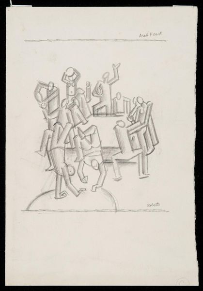 Curator: This is Frances Richards' "Praying to the Animals," currently held in the Tate Collections. Look closely at the etching; what’s your initial sense of it? Editor: Ethereal, almost dreamlike. The composition feels like a half-remembered story, all those figures in prayer while animals float above them. Curator: Richards seems to be exploring the archetypal relationships between humans and animals here. Notice how the animals aren't simply present; they're integrated into the spiritual act of prayer. Editor: Absolutely. The bells suspended among the animals, for me, amplify a call to awareness and interspecies connectivity. It's as if the natural world is both witness and participant in our spiritual lives. Curator: The visual language suggests a deep reverence for the animal kingdom. It's fascinating how Richards uses symbolic imagery to express universal themes of devotion and our connection to nature. Editor: It makes me think about how, in our modern disconnection, we've lost sight of animals as divine messengers. Richards reminds us of the sacred in the everyday, the wild within the worship. Curator: A powerful thought, and certainly something to contemplate as we move through the exhibition.