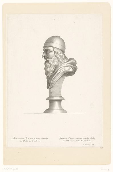 Etienne Baudet created this print of an antique bust of Minerva, likely using engraving techniques. The composition immediately draws the eye to the smooth, curvilinear forms of the bust, contrasted against the flatness of the background. The monochromatic palette enhances the sculpture's contours and emphasizes its classical origins. Consider how Baudet uses line and shadow to create depth. The incised lines define Minerva’s helmet and facial features, giving a sense of three-dimensionality on a two-dimensional surface. This technique reflects a broader interest in the period with classical forms and the representation of volume and space. The print engages with the philosophical notion of mimesis, or imitation, a cornerstone of classical aesthetics. Baudet isn’t merely copying an object; he’s interpreting and translating sculpture into another medium. This invites us to think about the nature of representation itself. The clean lines and formal structure, invites us to view art as a site of intellectual inquiry and cultural dialogue.
