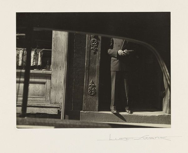 Curator: This is Robert Frank’s gelatin-silver print, “Actors--Filming 'Steibruch',” from 1942. The title itself gives insight to the process. Editor: It has such a stark and somber feel, doesn’t it? The heavy shadows really amplify the intensity of the scene. Almost oppressive. Curator: Yes, look at the textural qualities; Frank captured this with very high contrast. You can see this in the way the light reflects off the actors' clothes. This choice contributes greatly to the image’s gritty realism, wouldn't you say? I see how Frank transforms the materiality of filmmaking, highlighting its own staged nature by his choices of print making. Editor: Indeed. Realism also defines the historical context; cinema, particularly during this time, served as a powerful tool for propaganda and shaping public perception, especially in war time Europe. How do you see this impacting the photo itself? Curator: That's important context. You can see the bare wooden construction of the set. Frank uses the camera to emphasize the physical labour and the makeshift nature of the production, questioning the relationship between art and the socio-political climate of Switzerland during this era. Editor: Right. And you see how it highlights the behind-the-scenes, raw reality against what viewers expect. It really deconstructs the cinematic illusion. It's such an interesting reflection on artifice and the power dynamics at play, given that photography has often been used to influence public opinion. Curator: I'd also like to touch upon his choice of the gelatin-silver print which affects the look of monochrome. You feel it affects the overall feel and tone? Editor: Absolutely, It gives it that timeless feel, cementing the relationship of the historical themes captured, with the contemporary moment. Curator: A compelling and poignant glimpse behind the camera's lens, reminding us of cinema’s ability to construct a new world. Editor: Indeed, offering both an intimate and sobering look into the workings of media creation and its role in shaping our realities.