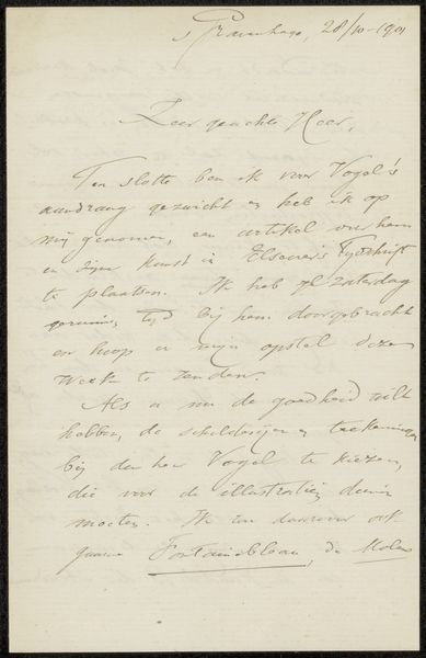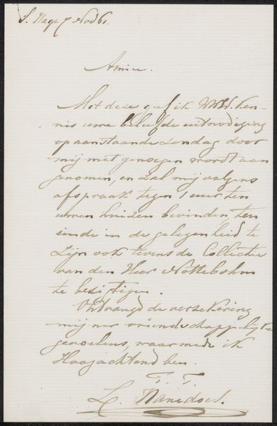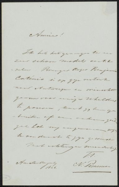 This letter to Ary Johannes Lamme was written by Karel-Hendrik Geerts and dates back to April 30, 1830. As a visual object, this letter embodies a specific history of communication. In its language and tone, it speaks to the social structures of its time, hinting at the dynamics of patronage and artistic networks. Addressed to the notable painter Ary Johannes Lamme, the letter subtly negotiates the dynamics of artistic recognition and support. The letter, written in French, seems to request Lamme’s attention for “Mr. Venotier”, so that he can give a "bonne affaire.” This act of referral suggests a system of social capital that artists navigated. The careful script and formal address reflect the norms of 19th-century correspondence, and the letter represents a world of interpersonal relationships. How might the act of physically writing and sending such a letter shape the exchange between these individuals? What are the emotional undertones present in this careful composition of words? Such objects act as portals to understanding the artistic community of the time.