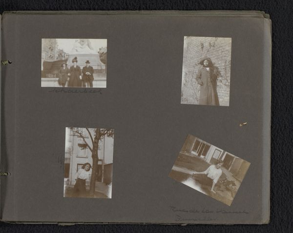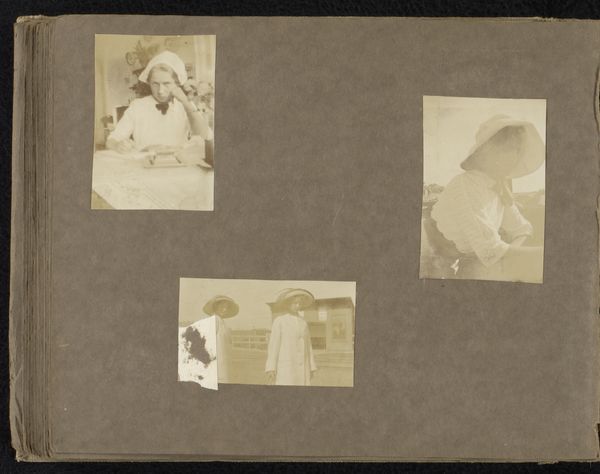 Editor: So, here we have "Vier foto's van een vakantie in Noordwijk"—Four Photos from a Holiday in Noordwijk—taken by Carolina (Loentje) Frederika Onnen, sometime between 1911 and 1918. They are albumen prints, so photography, but also something handmade... and almost like a relic from a distant era. It feels intimate, almost like flipping through someone’s family album. How would you interpret these images? Curator: For me, the material reality of the albumen print is key. We’re not just looking at photographs; we're looking at objects made with specific chemical processes. Albumen printing, popular then, required meticulous work with egg whites and silver nitrate. The labor embedded within the process reveals the societal value placed on capturing and preserving memories during this period. Editor: Interesting. So you are saying the materials used were as important as the final photos themselves? Curator: Precisely. Think about it. These weren’t mass-produced digital files. Each print required hands-on crafting. The muted tones aren’t just an aesthetic choice; they’re a consequence of the materials and techniques available. And who was performing this labor? What resources were readily available and accessible to those crafting them? Editor: It's fascinating to consider the economics and technology involved in making these photographs accessible during this era. It goes beyond just taking a snapshot. Curator: Exactly. Even the act of placing them in an album highlights the effort to organize and contextualize personal narratives within a specific social framework. Were they consciously emulating painted portraiture with the way the sitter is posed? Considering those processes makes the work richer, more meaningful. Editor: That makes so much sense! Thinking about the labor and resources needed highlights the value and exclusivity these photos possessed. I never would have considered the "material life" of a photograph! Curator: Precisely, seeing the process gives the final artifact so much more life.