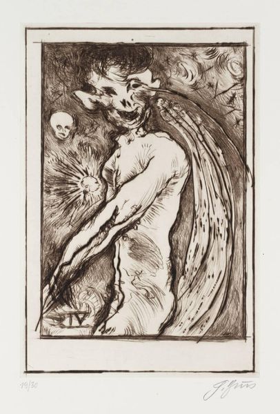 Editor: Here we have "Head Fantasy" by Tomás Joseph Harris, created as a print with engraving and drawing. The image is mesmerizing; I am drawn in by the incredible detail. How do you interpret this work, especially considering the title? Curator: The title, "Head Fantasy," immediately suggests a departure from realistic portraiture. Harris seems less interested in capturing a likeness and more in exploring ideas, perhaps psychological states or mythical narratives linked to the head. Consider how the dense linework and almost grotesque features might reflect anxieties or power dynamics prevalent in Harris's time or perhaps a broader commentary on patriarchal structures. Editor: That’s interesting. So, you’re suggesting the fantasy is less about beauty and more about something darker, even political? Curator: Exactly. Art often mirrors and critiques societal norms. The exaggerated features and the seemingly pained expression could represent the burdens of authority or the internal struggles of a man grappling with societal expectations. Who gets to be a "head" of state, of household, or other type of leadership role, and what kind of identity are they ascribing to and promoting? What visual cues support this interpretation for you? Editor: The eyes, definitely. They look heavy, burdened. Also, the lines around the mouth suggest stress, maybe even repressed anger? Curator: Precisely! These observations link directly to a broader dialogue around representation and power. The engraving, a readily reproducible medium, also points to wider accessibility of these critical commentaries, reaching diverse audiences and prompting discussions around often overlooked narratives. Editor: That makes me see it in a completely different light. Thank you. I never thought about the medium as part of the message itself. Curator: The power of art lies in its capacity to invite new ways of seeing the world. Every detail offers a potential clue into wider societal contexts, gendered identities and even political viewpoints.