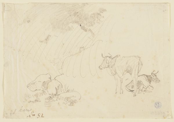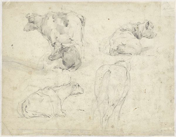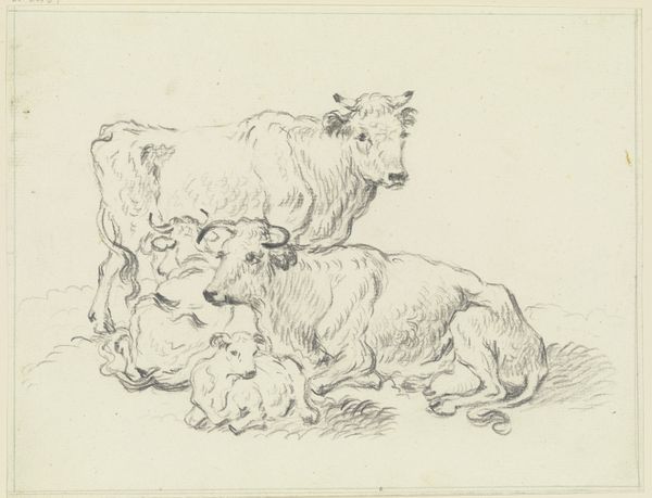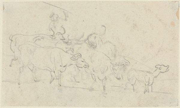 Curator: Right in front of us, we have Nicolaes Berchem’s "Nine Sheep", a drawing housed here at the Städel Museum. It’s crafted with chalk and graphite on paper. Editor: My immediate impression is of gentle observation. There’s a raw, unassuming quality, almost like flipping through a sketchbook of animal studies. The grayscale and sketch-like quality invite me into a peaceful, bucolic space. Curator: Berchem, who worked during the Baroque period, often included animals in his pastoral scenes. Sheep in particular often carried symbolic weight within Christianity, referencing innocence, gentleness and of course, the concept of the flock. Editor: Considering the socio-economic landscape of the Dutch Golden Age, could this work also speak to a celebration of pastoral simplicity, amidst growing urban wealth and expansion driven by the livestock market? Perhaps the image idealizes a slower pace and emphasizes agrarian life. Curator: That's definitely plausible. But I also see a connection with older iconographic traditions, for instance in the numerous depictions of the Lamb of God, in which this humble creature attains truly mythic and divine stature. There's a layering of meanings occurring here. Editor: Indeed, and beyond religious undertones, these studies might tap into contemporary philosophical discourse around the dignity of labor and human-animal bonds. By offering meticulous details in the fleece and posture, Berchem invites consideration of the animals’ intrinsic worth beyond its utilitarian function. Curator: It's compelling to ponder how we, as viewers across centuries, continuously engage with these representations. Our readings shift as cultural, spiritual and political contexts evolve. The humble sheep becomes an intersection where human perception, symbolism, and social meaning intertwine. Editor: Ultimately, viewing Berchem's work through an activist lens urges us to examine these connections of animal, labor, and environment within a deeper social consciousness. This seemingly straightforward depiction provides ample food for critical thought and inquiry. Curator: Yes, engaging with these images makes one realize the potential within artworks to resonate with cultural memory while speaking to contemporary concerns.