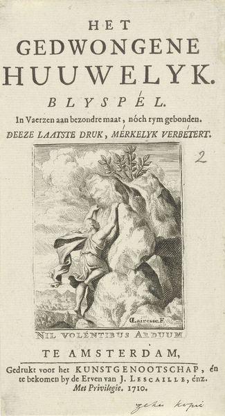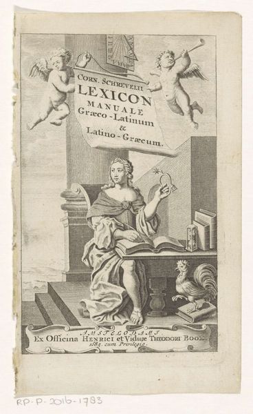 Curator: This is the title page for the pamphlet "Rouwklagt van de Fransche Apollo over de Verdorde Distelbloem, 1701," created by Romeyn de Hooghe. It's an engraving dating back to 1701, here on display at the Rijksmuseum. Editor: It has such a distinct appearance. The use of line and the parchment-like appearance of the paper make it appear simultaneously aged and vital. Curator: Indeed. We can view this work through a material lens; consider the paper itself. It served as a substrate for disseminating political discourse. How the engraver's labor interacts with this substrate— the tools used to imprint an image that carried significance. Editor: And the image! We have Apollo, representing France, mourning a withered thistle, presumably Scotland's national symbol. Note his expression—almost theatrical, wouldn’t you agree? And he’s right in front of a building evoking Versailles and directly impinging on that wilting thistle. It’s not just grief; it’s a complex web of national identity, loss, and political tension embodied in this dramatic tableau. Curator: Yes, and think of how prints like these, though seemingly simple, were reproduced. The social context allowed for dissemination, creating widespread reach and shaping the collective narrative during the war of the Spanish Succession. Consider the availability of materials; the workshop structures, the printmaker’s skills and how the economy drove the production and circulation of this type of imagery. Editor: I am intrigued by how De Hooghe blended mythological and contemporary symbolism. The title, “Rouwklagt” (mourning song), coupled with Apollo, god of music, art, and prophecy, infuses emotional resonance, while the "withered thistle" speaks directly to political struggles. It asks us to reflect upon a moment where these complex meanings become fused within this single image. Curator: Exactly. Looking closely, one sees the fine lines and the meticulous process by which these ideas have been materially produced and brought into wider distribution for contemporary audiences to interact with. It emphasizes the physical dimension and lived labor that generates artistic and intellectual capital. Editor: And understanding the power of allegory through this historical print makes one appreciate the subtle persistence of symbolic thinking through art history and today. I wonder how those ideas can find continued presence in new settings.