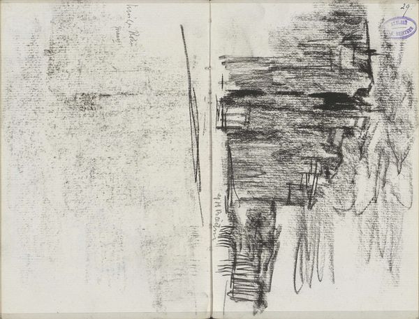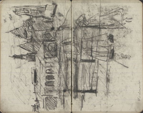 Curator: This sketch captures the Rokin in Amsterdam as seen through the eyes of George Hendrik Breitner between 1893 and 1898. We're looking at a pencil and graphite drawing currently held at the Rijksmuseum. Editor: Immediately, I'm struck by the dense, almost claustrophobic feeling. The heavy use of graphite creates such a murky, urban atmosphere; I find it hard to breathe just looking at the marks on the page. Curator: That dense feeling really mirrors Breitner's project of representing the gritty reality of Amsterdam. The late 19th century was a time of immense social change, with the rapid growth of cities. Artists like Breitner played a pivotal role in how urban experience was represented, and the sketch's intensity reflects a modern social tension. Editor: True, the layering of dark tones and rapid lines communicates anxiety or maybe excitement over the urban flux. What do you make of the open composition? It bleeds across the sketchbook's spine to imply an extension. The choice emphasizes the continuousness of the urban surrounding, yet does so by halting visual information in the physical boundaries of this sketchbook. Curator: Yes, I find it really interesting. Breitner positions the city within reach of everyone because of the sketchbook's small format, which emphasizes accessibility through his visible process, suggesting art is a tool for social navigation available to more than a wealthy class of patron. Editor: I notice a stark division in visual information. In the background, the shapes flatten in value and fade into scribbled shading; in the foreground, some building is outlined or suggested but without shading that grounds it. This emphasizes pictorial depth with a push-pull in planar arrangement. What about that sketch in the bottom-right corner? Do you read that mark as separate from the spatial composition as a whole? Curator: That's an intriguing aspect, and it might show us Breitner experimenting with representing different dimensions of urban life—the planned structure of the cityscape butting up against the more fragmented reality of experiencing the street. It's less about idealizing the urban and more about acknowledging its multifaceted realities. Editor: Looking at how quickly it was sketched, perhaps during his engagement with Amsterdam’s environment, helps clarify how to examine the planar divisions as experiments on how to convey spatial information in compressed form. In its totality, I find this sketch a document with clear, powerful, artistic intents. Curator: Exactly. It serves as a testament to Breitner's engagement with his time, an immediate snapshot in his socio-historic exploration.