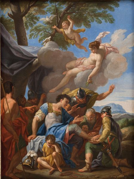 Curator: Looking at this, I immediately sense a certain swirling, exuberant energy. Almost chaotic. It feels as if I've stumbled into the middle of a festival, wild and uninhibited. Editor: We're looking at "Bacchanal Before a Statue of Pan", an oil on canvas painted by Nicolas Poussin in 1633, currently held at the National Gallery in London. In the spirit of the baroque period, it depicts a frenzied scene of revelry. It draws inspiration from ancient Roman mythology. Curator: Myth, yes, but painted with a distinctly human messiness. Look at the figures – some are graceful, others… well, rather clumsily drunk! There is something liberating in its abandonment. Almost like witnessing people pushing past social restrictions. Editor: Indeed. Poussin situates us within a history of bacchanals. These feasts weren't just about drunken merry-making; they held religious significance, celebrating liberation, fertility, and the dissolution of boundaries, especially around gender and social class. We might read it today through a lens of bodily autonomy and collective joy. Curator: That's really interesting because while it appears free and joyous, some of the scenes feel... borderline violent. Like that wrestling match near the statue. Is that playful roughhousing, or something more coercive? How might viewers from differing social backgrounds and gender identities experience this portrayal of hedonism? Editor: The tension is palpable, isn't it? Perhaps it reveals the complexities of these ecstatic rituals. They could be deeply empowering, but also fraught with the potential for transgression and abuse. It opens up space for us to acknowledge that power and privilege inevitably permeate even supposedly "liberated" spaces. It certainly is open to interpretation, but one can’t deny the power it holds to elicit thought, discussion, introspection on what constitutes safe enjoyment in a shared communal context. Curator: Absolutely. Art doesn’t exist in a vacuum. Context is everything. Now I see far more layers to that apparent mess. Editor: Right, the composition—it's not just a snapshot of drunken antics, but a window into how the artist, and by extension, we, reflect upon those aspects of being human as members of society. Thank you for your sharp insights; it truly has me thinking.