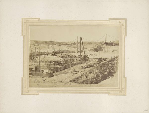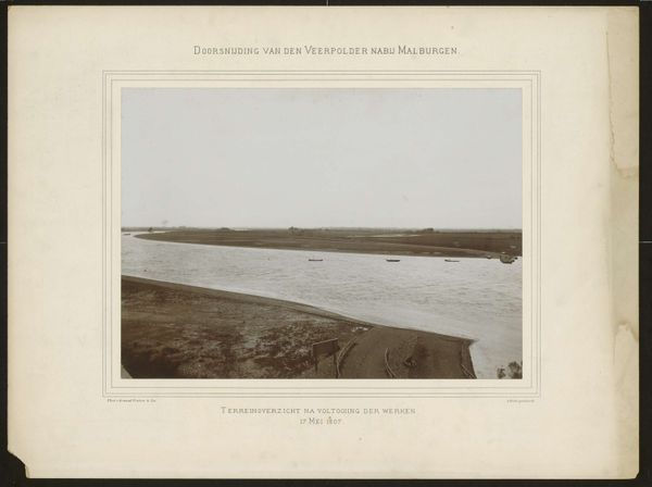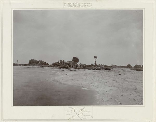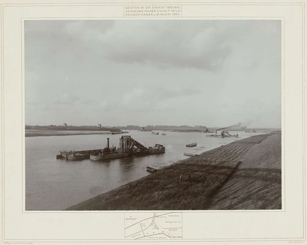 Editor: This photograph, “Kanaalboordvoorziening en oostelijke kanaaldijk door de Axelsche Vlakte met nieuw kanaal door den Nieuw-Papeschorpolder....” is likely from the early 1900s, around 1904-1908, by Sytze Reinder Elzinga. It’s a landscape captured in a black and white print, and what strikes me most is the stark contrast between the industrial equipment on the left and the serene river fading into the horizon. How do you interpret this work, especially its symbols and imagery? Curator: It’s compelling, isn’t it? The scene is rife with symbolism reflecting human ambition and intervention. Notice how the imposing dredging equipment disrupts the natural landscape. It represents progress, certainly, but also a forceful imposition on the environment. The smoke billowing in the distance perhaps symbolizes both industrial advancement and its potential cost, alluding to psychological concepts such as dominion. Editor: I see that. The smoke is faint but present, almost a shadow. So, the image becomes less about a simple landscape and more about… what humans *do* to the landscape? Curator: Precisely. Consider also the placement of the horizon line, bisecting the image. This emphasizes a duality – nature versus industry, past versus future. What cultural memory does this composition evoke for you? Are there other elements in the photograph which speak of control or indicate a struggle? Editor: Now that you point it out, that wooden stake driven into the land looks so lonely! Almost a symbol of humans versus the land...It makes you wonder about the environmental impact of progress back then, versus what we consider progress now. I’d never noticed how photography can reflect cultural anxieties in such a visual and compelling way. Curator: Exactly. Even this image—a seemingly straightforward landscape— holds layers of symbolic meaning, capturing the zeitgeist of a period defined by rapid industrial transformation and societal impact. The image speaks not only of the landscape but about humanity, technology, and environment and about time passing by.