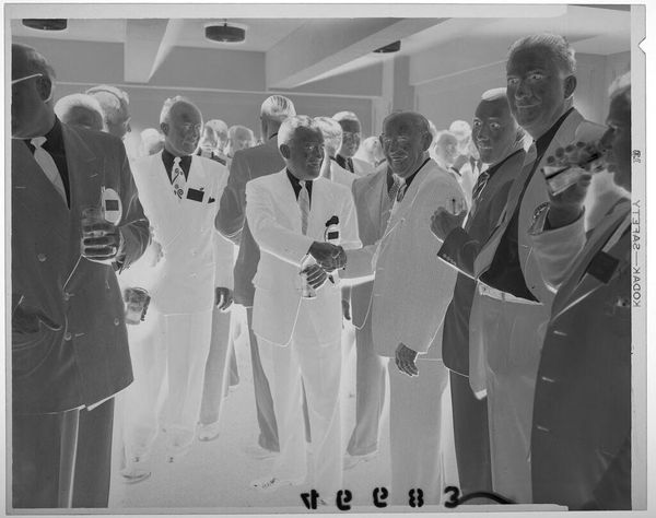 Curator: Martin Schweig’s "Untitled (five men in matching suits standing together with drinks in fancy room)" presents us with an intriguing scene frozen in time. Editor: My first impression is one of stark formality and almost eerie uniformity, highlighted by the limited tonal range. Curator: Indeed. The matching suits act as a visual cue, suggesting a unified purpose or identity. What do you make of that? Editor: It reads as a deliberate attempt to communicate power or status. Consider the strict geometry of their arrangement. It seems quite calculated. Curator: I agree. The drinks they hold become symbolic then, perhaps tokens of camaraderie or shared privilege. What is the picture of the woman in the background? Editor: The woman in the picture seems to be covered with a white cloth around her head. I think it is related to some sort of religious symbol. Curator: Yes it is. Thank you, editor, for your interesting review. Editor: Thank you! It was a pleasure.