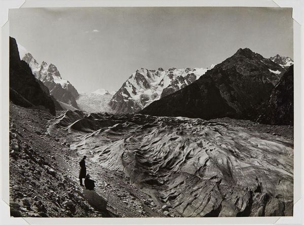 Curator: This is Samuel Bourne's "The Great Glacier and Snowy Peaks at the Head of Buspa Valley." The photograph presents a majestic landscape. Editor: The sepia tones lend the image a stark, almost desolate feel. The composition—the way the glacier dominates the foreground—is quite powerful. Curator: Bourne ventured into the Himalayas during the colonial era. His work, while celebrated for its artistry, also represents the Western gaze upon the East, and we must acknowledge the power dynamics inherent in that. Editor: But let's look at the technique: the sharp focus across such a vast distance, the gradations of light on the rock faces. It is extraordinary, regardless of its historical context. Curator: The sublime, certainly, but also the colonial project's ambition to map and claim territory. Bourne's photographs became crucial documents, shaping perceptions of the region. Editor: Perhaps. But the photograph's geometric structure, the play of light and shadow creating depth and dimension, is undeniably beautiful. Curator: Beauty with a complex history. Editor: Indeed. The two are not mutually exclusive.