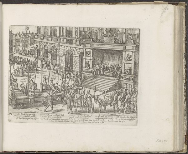 This print, made in 1576 by Frans Hogenberg, depicts the imprisonment of the Council of State. The etching process—using acid to bite lines into a metal plate—allows for a detailed, reproducible image, perfectly suited for spreading political messages in a time of conflict. Look closely, and you'll see the sharp, precise lines that define the figures and architectural settings. The rigid formation of soldiers with their pikes, and the frantic struggle of the Council members are all captured with remarkable clarity, thanks to the etcher's skill. Hogenberg's choice of printmaking underscores the themes of power, control, and the dissemination of information. By using a process that enables mass production, the artist ensured his visual account of this historical event could reach a wide audience, influencing public opinion. This speaks to the powerful role of craft and design in shaping social and political narratives. The work invites us to consider the relationship between art, the means of its production, and its impact on society.