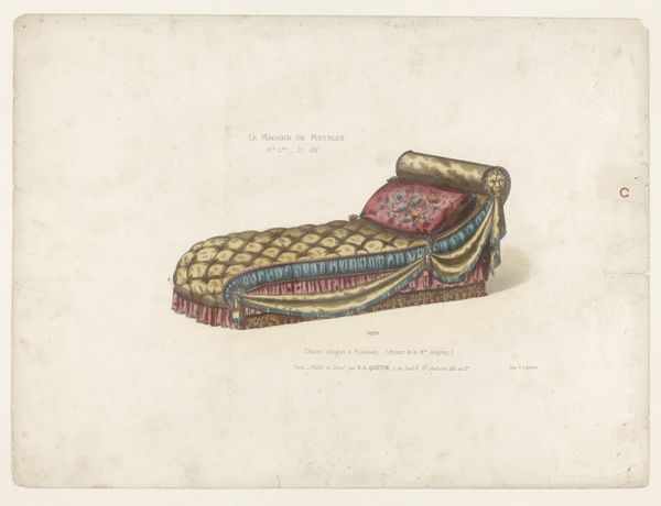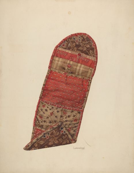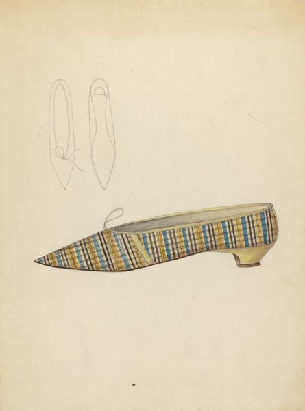 Editor: Here we have Frank Maurer’s "Woman’s Slipper," a watercolor and drawing piece created between 1935 and 1942. It strikes me as…nostalgic, somehow. Like a memory gently rendered in soft colors. What do you see when you look at it? Curator: Nostalgia is spot-on. For me, it’s all about the intimacy of the object. Imagine someone painstakingly rendering every stitch, every little imperfection of this well-worn slipper. There’s a quiet reverence here. Do you get a sense of domesticity? Editor: Absolutely! The zigzag pattern and those gentle reds and greens... it's comforting. Like something your grandmother might have made. It feels very personal, in its quietness. I'm curious, why depict something so ordinary? Curator: That’s the heart of it, isn’t it? Artists often elevate the everyday to something worthy of contemplation. Maybe Maurer found beauty in the simplicity, a story in the worn threads. It's almost like a portrait, not of a person, but of a life lived. A visual poem about the comfort of the mundane. Makes you wonder what stories that slipper could tell, doesn’t it? Editor: It does. I hadn't thought about it that way. It makes you appreciate how an object, so simple, can hold so much…presence. Curator: Exactly! It reminds me that even the smallest things can hold immense meaning and, when viewed through the artist’s eye, can unlock a whole world of feeling. Editor: That's a powerful way to think about art. Curator: I hope it gives our listeners a newfound appreciation for those quiet stories hiding in plain sight, everywhere!