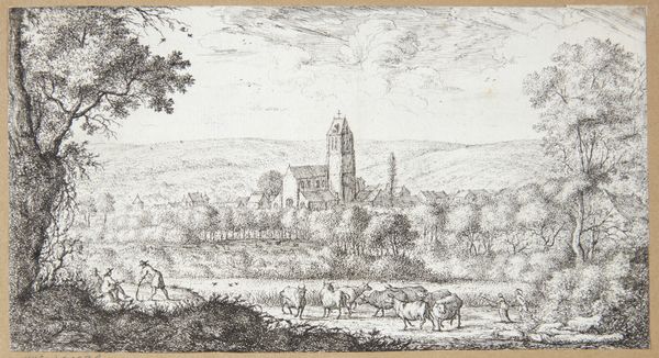 Curator: This is Claude Lorrain's etching, "The Herd Being Driven in Stormy Weather," part of the Harvard Art Museums collection. Editor: It has a somber feel, a kind of impending doom almost—the contrast of the bright opening to the landscape versus the shadowed foreground is striking. Curator: Lorrain's landscapes weren't merely depictions; they constructed an ideal. Note the crumbling architecture juxtaposed with the natural world. It speaks to the materiality of empire and its inevitable decline. The etching process itself, with its lines and tones, mimics the layered reality of decay. Editor: Absolutely, and the presence of the herd being driven, controlled—it highlights the power dynamics inherent in land use and the subjugation of nature for human needs. There is also a commentary on class and labor. Curator: I see it more as a meditation on the pastoral tradition and its artificiality. Lorrain was making prints for a market, responding to a demand for idealized landscapes. Editor: True, but that demand reflects a social context, a longing for a simpler life while exploiting resources. The print becomes a commodity, feeding into the very system it romanticizes. Curator: Perhaps. It's a complex interplay, and this small etching holds within it many fascinating tensions. Editor: It does give us much to consider.