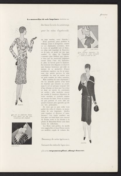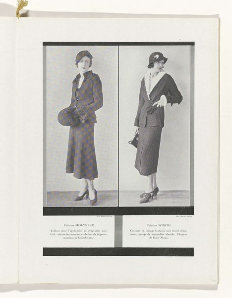 Curator: This image, titled "Art - Goût - Beauté, Feuillets de l'élégance féminine, Novembre 1931," comes from a fashion magazine printed in November 1931, part of its 12th year of publication. Editor: There's a wistful elegance to it. The grayscale lends a timeless quality, and the composition feels quite balanced with two figures placed side-by-side. Curator: The choice of photography for a fashion magazine reflects a shift toward capturing modern lifestyles and consumer culture in interwar France. The production and distribution of this periodical would have been intimately linked to the textile and fashion industries. The printing press itself and photography were relatively new processes compared to illustration for fashion. Editor: Agreed. Focusing on form, I'm intrigued by the subtle contrasts. On the left, softer lines with what appears to be a flowing dress or suit are juxtaposed against the geometric pleats of the dress on the right. Note also the darker solid blacks highlighting text against the grayscale image. The light and shadow fall across the models’ faces and costumes, drawing the eye. Curator: And beyond aesthetics, these were commodities destined for mass consumption, showcasing modern design principles. This also offered women access to fashion ideals in a time when clothing and self-presentation were forms of social expression, subject to trends driven by capitalism. Editor: True. There's definitely an interplay between the "high art" portraiture style and commercial motives. The textures also read differently. The outfit on the left appears textured, with lace trim while on the right is smoother, likely due to the knit fabric. Curator: We must remember that fashion wasn't just about style. Consider the conditions under which those fabrics were produced, the labor involved, the socio-economic impact of the clothing industry. Editor: Absolutely. These images were carefully composed with geometric symmetry to reflect the Art Deco designs, a semiotic system designed to convey the essence of feminine style and the spirit of a new era. I’ve thoroughly enjoyed teasing out both their formal qualities and also the broader social implications and the economic landscape framing their original production. Curator: It's crucial to view this artwork not as a singular artistic expression but as a byproduct of complex economic processes—a reflection of material production, consumerism, and societal power dynamics. These elements are intricately interwoven into the final visual form that so captivates the eye.